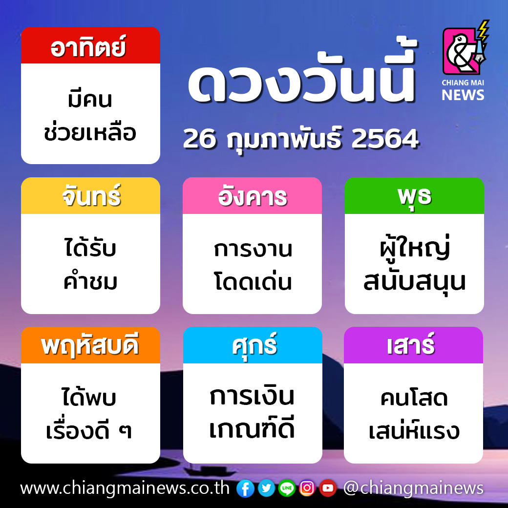 ?ท่านที่เกิดวันพุธ วันนี้เป็นวันแห่งโชค สิ่งที่คิดหวังไว้สำเร็จได้ง่าย เป็นช่วงที่เหมาะกับการเสี่ยง และลงทุน การเข้าหาผู้ใหญ่จะได้รับการสนับสนุนที่ดี การทำงานราบรื่น และเป็นจังหวะที่ดีสำหรับการทำงานเสริม คนโสด ได้เจอเหตุการณ์น่าประทับใจ