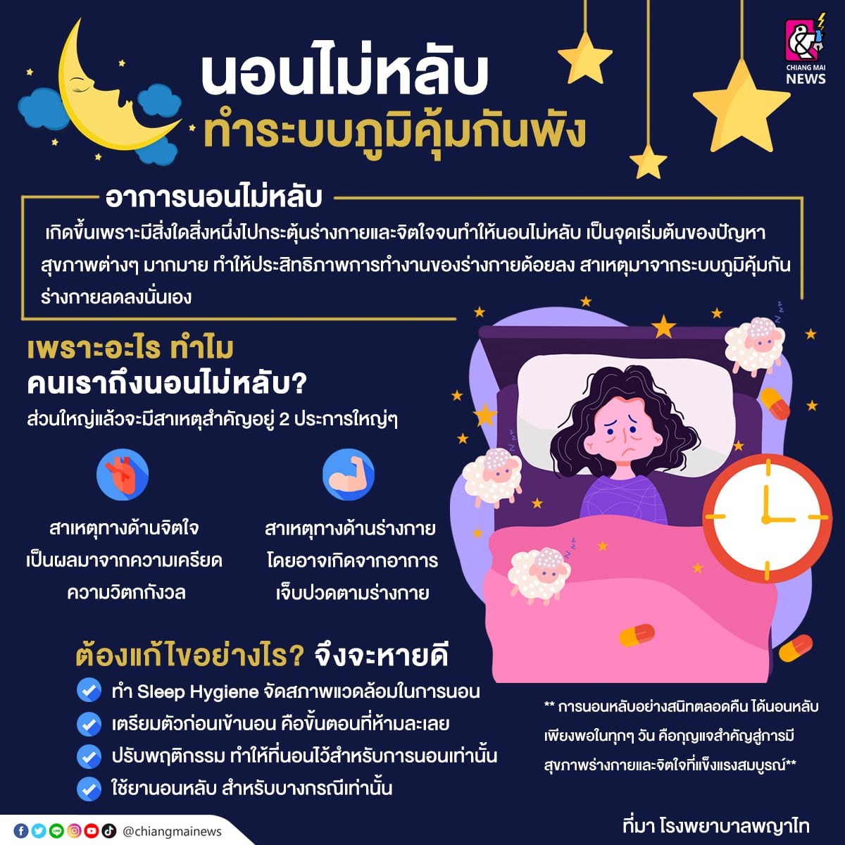 การนอนหลับอย่างสนิทตลอดคืน ได้นอนหลับเพียงพอในทุกๆวัน คือกุญแจสำคัญสู่การมีสุขภาพร่างกายและจิตใจที่แข็งแรงสมบูรณ์ และถึงแม้ว่าเราจะไม่ได้มีปัญหานอนไม่หลับ แต่การใช้ชีวิตแบบนอนไม่เป็นเวลา นอนดึกติดต่อกันหลายคืนนั้น สุดท้ายแล้วก็จะส่งผลเสียต่อร่างกายและจิตใจได้เช่นกัน ดังนั้นเราจึงควรใส่ใจกับการแบ่งเวลาในการนอนให้ดี เข้านอนให้เป็นเวลา พักผ่อนให้เพียงพอ เพื่อเป็นการสร้างรากฐานของการมีสุขภาพที่ดี อันนำมาซึ่งคุณภาพชีวิตที่ดีและมีความสุขอย่างที่เราทุกคนต้องการ