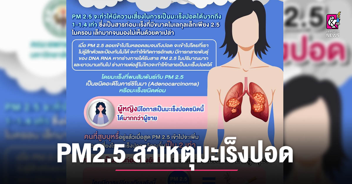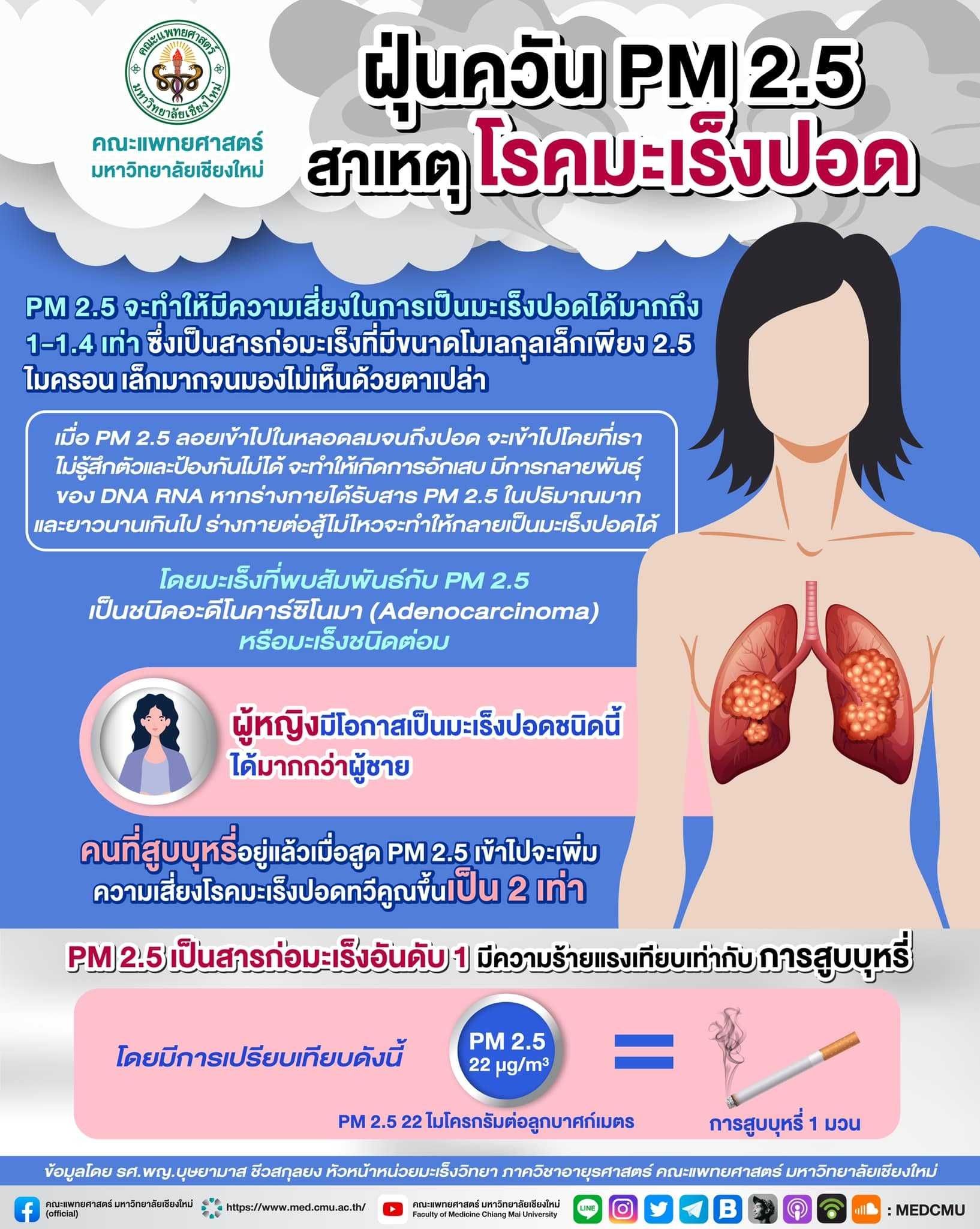 ปัจจัยเหล่านี้เพิ่มความเสี่ยงประมาณ 2.5 เท่า หากเราไม่มีความเสี่ยงอะไรแต่เราอยู่ในสภาวะที่มี PM2.5 จะทำให้มีความเสี่ยงในการเป็นมะเร็งปอดได้มากถึง 1-1.4 เท่า ซึ่ง PM2.5 เป็นสารก่อมะเร็งที่มีขนาดโมเลกุลเล็กเพียง 2.5 ไมครอน เล็กมากจนมองไม่เห็นด้วยตาเปล่า ดังนั้นเมื่อ PM2.5 ลอยเข้าไปในหลอดลมจนถึงปอด จะเข้าไปโดยที่เราไม่รู้สึกตัวและป้องกันไม่ได้ เมื่อเข้าไปในปอดแล้วก็จะทำให้เกิดการอักเสบ มีการกลายพันธุ์ของ DNA RNA หากร่างกายได้รับสาร PM2.5 ในปริมาณมากและยาวนานเกินไป ร่างกายต่อสู้ไม่ไหวจะทำให้กลายเป็นมะเร็งปอดได้ โดยมะเร็งที่พบสัมพันธ์กับ PM2.5 ก็คือเป็นชนิดอะดีโนคาร์ซิโนมา (Adenocarcinoma) หรือมะเร็งชนิดต่อม ซึ่งผู้หญิงมีโอกาสเป็นมะเร็งปอดชนิดนี้ได้มากกว่าผู้ชาย ส่วนคนที่สูบบุหรี่อยู่แล้วเมื่อสูด PM2.5 เข้าไปจะเพิ่มความเสี่ยงโรคมะเร็งปอด ที่จะทวีคูณขึ้นเป็น 2 เท่า