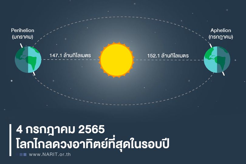 4 กรกฎาคม 2565 เป็นวันที่โลกโคจรอยู่ห่างดวงอาทิตย์ที่สุดในรอบปี หรือที่เรียกว่าจุด “อะฟีเลียน” (Aphelion) จุดที่โลกเราอยู่ห่างดวงอาทิตย์ที่สุดในรอบปี ระยะทางประมาณ 152,098,455 กิโลเมตร ในเวลา 14:10 น. ตามเวลาประเทศไทย