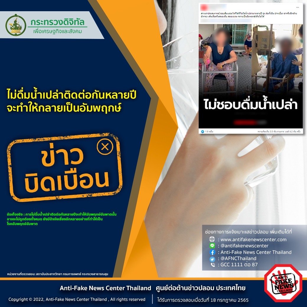 กรณีที่มีข้อความในสังคมออนไลน์เกี่ยวกับประเด็นเรื่องไม่ดื่มน้ำเปล่าติดต่อกันหลายปีจะทำให้กลายเป็นอัมพฤกษ์ ทางศูนย์ต่อต้านข่าวปลอม กระทรวงดิจิทัลเพื่อเศรษฐกิจและสังคม ได้ดำเนินการตรวจสอบข้อเท็จจริงโดยสถาบันประสาทวิทยา กรมการแพทย์ กระทรวงสาธารณสุข พบว่าประเด็นดังกล่าวนั้น เป็นข้อมูลบิดเบือน