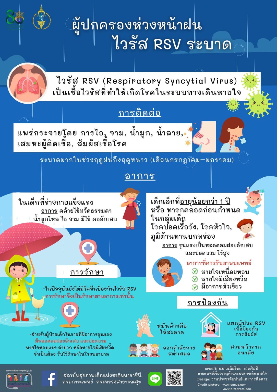 กรมการแพทย์ โดยสถาบันสุขภาพเด็กแห่งชาติมหาราชินี แนะให้ผู้ปกครองเฝ้าระวังบุตรหลานของท่าน ในช่วงฤดูฝนนี้เป็นฤดูกาลระบาดของเชื้อไวรัส RSV กำลังระบาดติดต่อกันง่าย ผู้ปกครองควรหมั่นสังเกตอาการทางระบบทางเดินหายใจของลูกหลานอย่างใกล้ชิด
