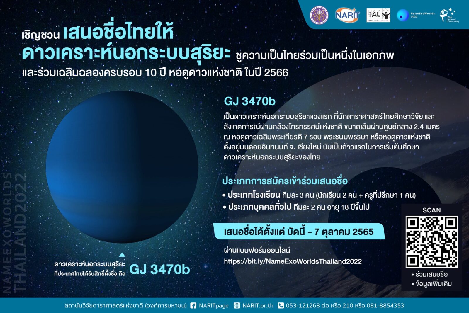 ประเทศไทย โดย NARIT ในฐานะหน่วยงานดาราศาสตร์ของไทย และหนึ่งในสมาชิกระดับประเทศของสหพันธ์ดาราศาสตร์นานาชาติ ได้รับสิทธิ์ให้เข้าร่วมเสนอชื่อ “ดาวเคราะห์นอกระบบสุริยะเป็นชื่อไทย” ได้แก่ ดาวเคราะห์นอกระบบสุริยะ GJ 3470b
