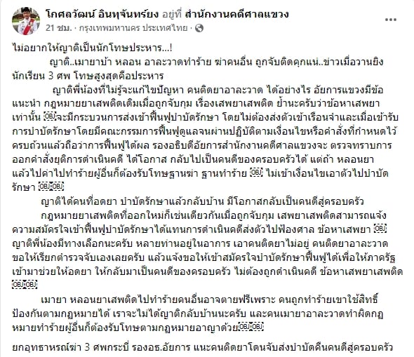 8 ก.ย. 65 นายโกศลวัฒน์ อินทุจันทร์ยง รองอธิบดีอัยการสำนักงานคดีศาลแขวงโพสต์เฟซบุ๊กส่วนตัวให้ความเห็นกรณี คนคลั่งยายิงนักเรียน 3 ศพ ระบุว่า