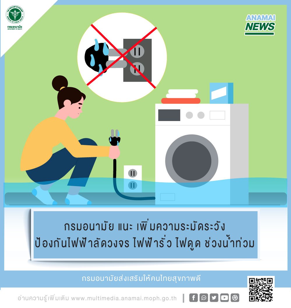 กรมอนามัย กระทรวงสาธารณสุข แนะประชาชนในพื้นที่เสี่ยงน้ำท่วม ให้เพิ่มความระมัดระวังอุปกรณ์เครื่องใช้ไฟฟ้าภายในบ้าน หมั่นตรวจสอบความชำรุดเสียหาย ป้องกัน ไฟฟ้าลัดวงจร ไฟฟ้ารั่ว ไฟดูดช่วงหน้าฝน และในภาวะน้ำท่วมขัง