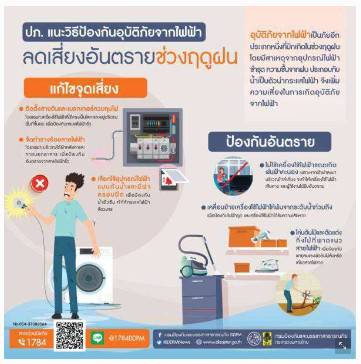 ทั้งนี้ การตรวจสอบเครื่องใช้ไฟฟ้าให้อยู่ในสภาพใช้งานได้ปลอดภัยและเพิ่มความระมัดระวังในการใช้งานเครื่องใช้ไฟฟ้า จะช่วยป้องกันอันตรายจากไฟฟ้ารั่ว และไฟฟ้าดูดในช่วงฤดูฝนได้