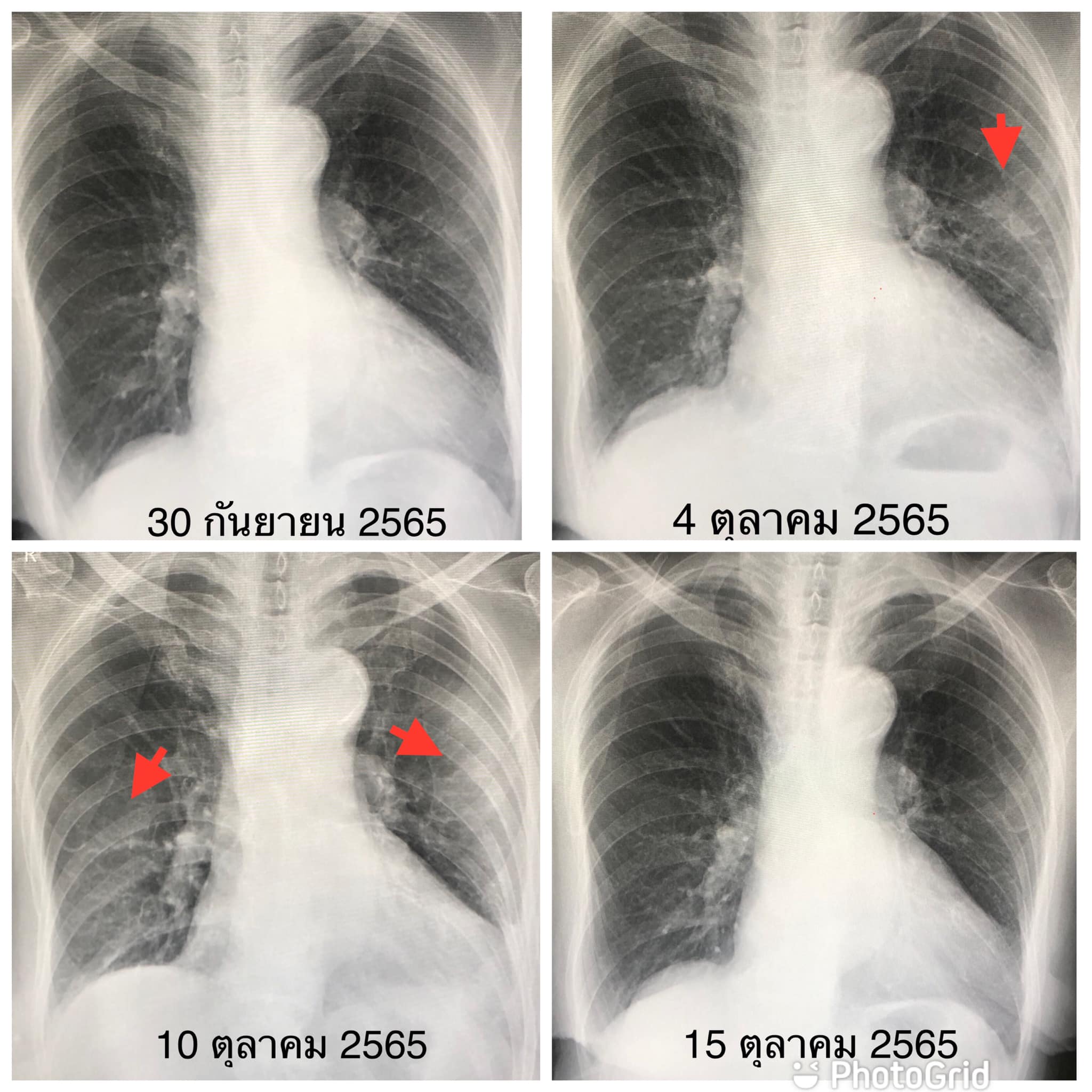10 วันต่อมา ยังไอต่อเนื่อง มีเสมหะ ไม่มีไข้ ไม่เหนื่อย ระดับออกซิเจนที่ปลายนิ้ว 95% เอกซเรย์ปอดมีฝ้าขาวเพิ่มขึ้นทั้ง 2 ข้าง(ดูรูป) ให้ยาสเตียรอยด์ขนาดต่ำ 5 วัน
