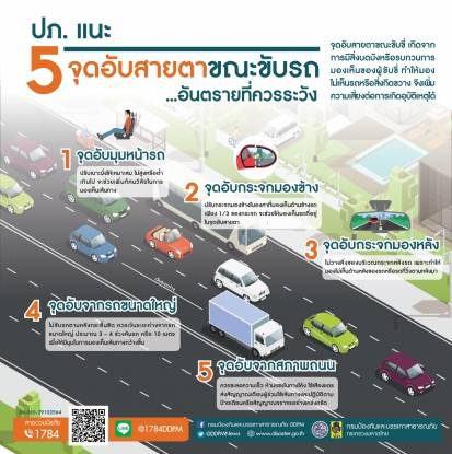 “จุดอับสายตา” เกิดจากการมีสิ่งบดบังหรือรบกวนการมองเห็นของผู้ขับขี่ ทำให้มองไม่เห็นรถหรือสิ่งกีดขวางในบางจุด จึงเพิ่มความเสี่ยงต่อการเกิดอุบัติเหตุ เพื่อความปลอดภัย กระทรวงมหาดไทย โดยกรมป้องกันและบรรเทาสาธารณภัย (ปภ.) ขอแนะข้อควรปฏิบัติเพื่อป้องกันอุบัติเหตุจากจุดอับสายตาขณะขับรถ ดังนี้