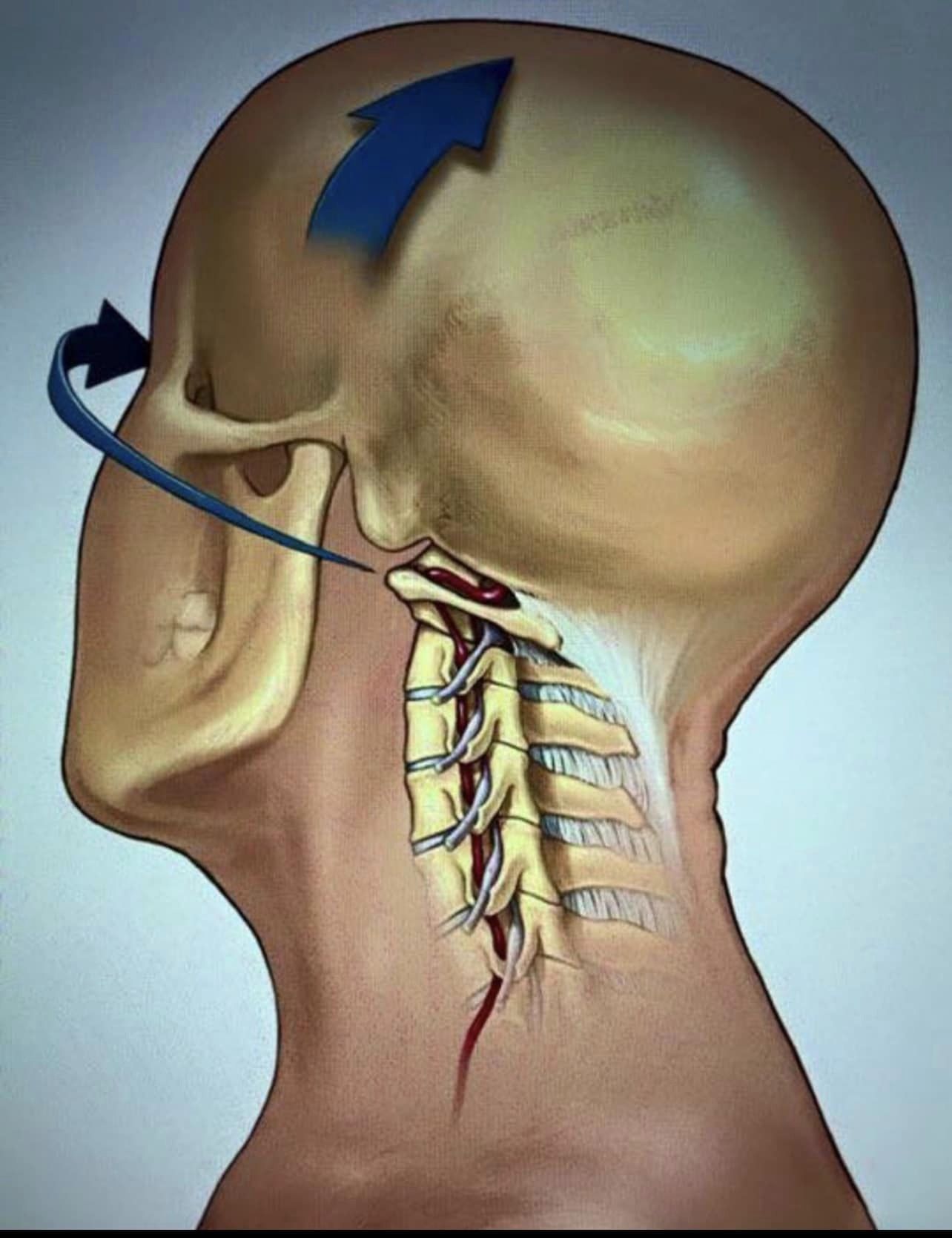 สมองของเรามีเส้นเลือดไปเลี้ยง 2 คู่ คู่หน้าสามารถคลำได้ตุบๆที่คอด้านหน้าซึ่งไปเลี้ยงสมองหน้าผากขมับ 2 ข้าง รวมทั้งสมองส่วนลึกลงไปทางด้านใน เส้นเลือดคู่หลังร้อยผ่านกระดูกก้านคอ และเลื้อยผ่านเข้าไปหล่อเลี้ยงสมองท้ายทอยซึ่งเป็นจอรับภาพ สมองน้อยด้านหลัง คุมการทรงตัว ก้านสมองซึ่งควบคุมประสาทสมองรวมการเคลื่อนไหวลูกตา คุมการรับรู้สึกตัว การเคลื่อนไหวแขนขา การสะบัดคอแรงๆ การหมุนคอบิด บริหารประจำอาจทำให้เกิดผลร้าย