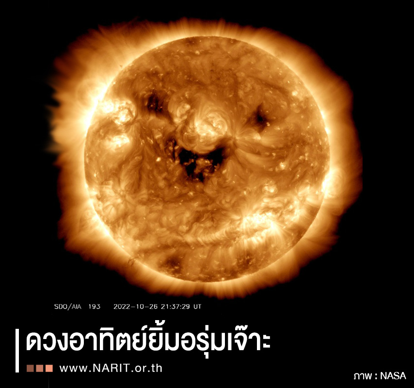 ปลายเดือนตุลาคม ที่ผ่านมา NASA เผยภาพถ่ายในช่วงคลื่น X-ray และช่วงคลื่นอัลตราไวโอเลตที่เรียกว่า Extreme Ultraviolet (EUV) แสดงให้เห็นรอยดำมืดลักษณะคล้ายกับหน้ากำลังยิ้มบนดวงอาทิตย์ ซึ่งเกิดจากพลาสมาที่มีความหนาแน่นสูงและมีอุณหภูมิต่ำกว่าบริเวณรอบๆ นักดาราศาสตร์เรียกบริเวณนี้ว่า หลุมโคโรนา (Coronal hole)