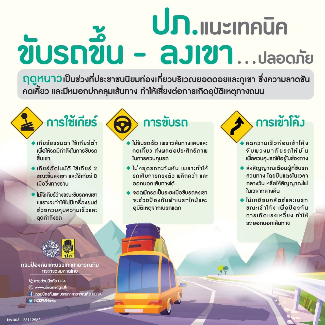 ฤดูหนาวเป็นช่วงที่ประชาชนนิยมท่องเที่ยวตามยอดเขาหรือเชิงดอย ซึ่งสภาพเส้นทางขึ้น – ลงเขามีความลาดชัน ประกอบกับมักมีหมอกปกคลุมเส้นทาง ทำให้มีความเสี่ยงต่อการเกิดอุบัติเหตุทางถนน เพื่อความปลอดภัย กรมป้องกันและบรรเทาสาธารณภัย (ปภ.) ขอแนะข้อควรปฏิบัติในการขับรถผ่านเส้นทางลาดชันและเส้นทางที่มีหมอกควันปกคลุมอย่างปลอดภัย ดังนี้