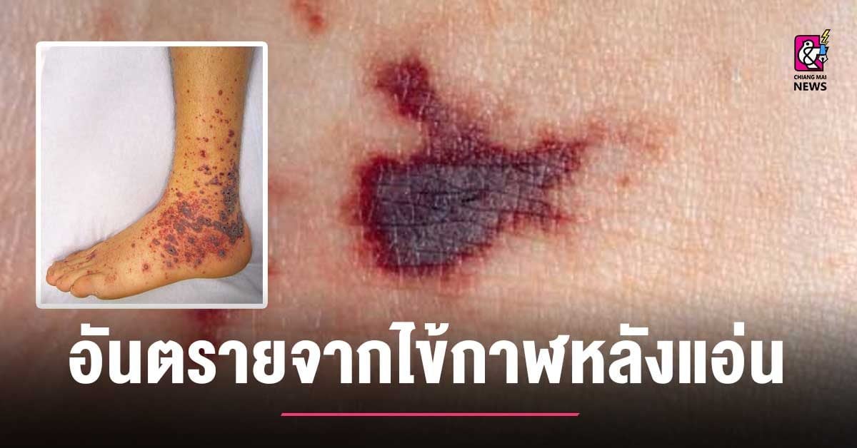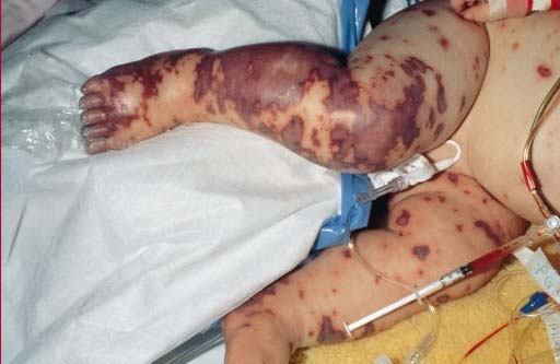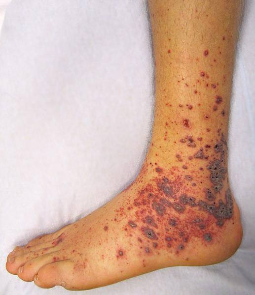 ในรายที่อาการรุนแรงและเข้าสู่ระยะหลัง ๆ ที่ผิวหนังจะมีลักษณะม่วงเข้มเป็นปื้น ๆ ซึ่งเกิดมาจากเลือดออกที่บริเวณผิวหนัง