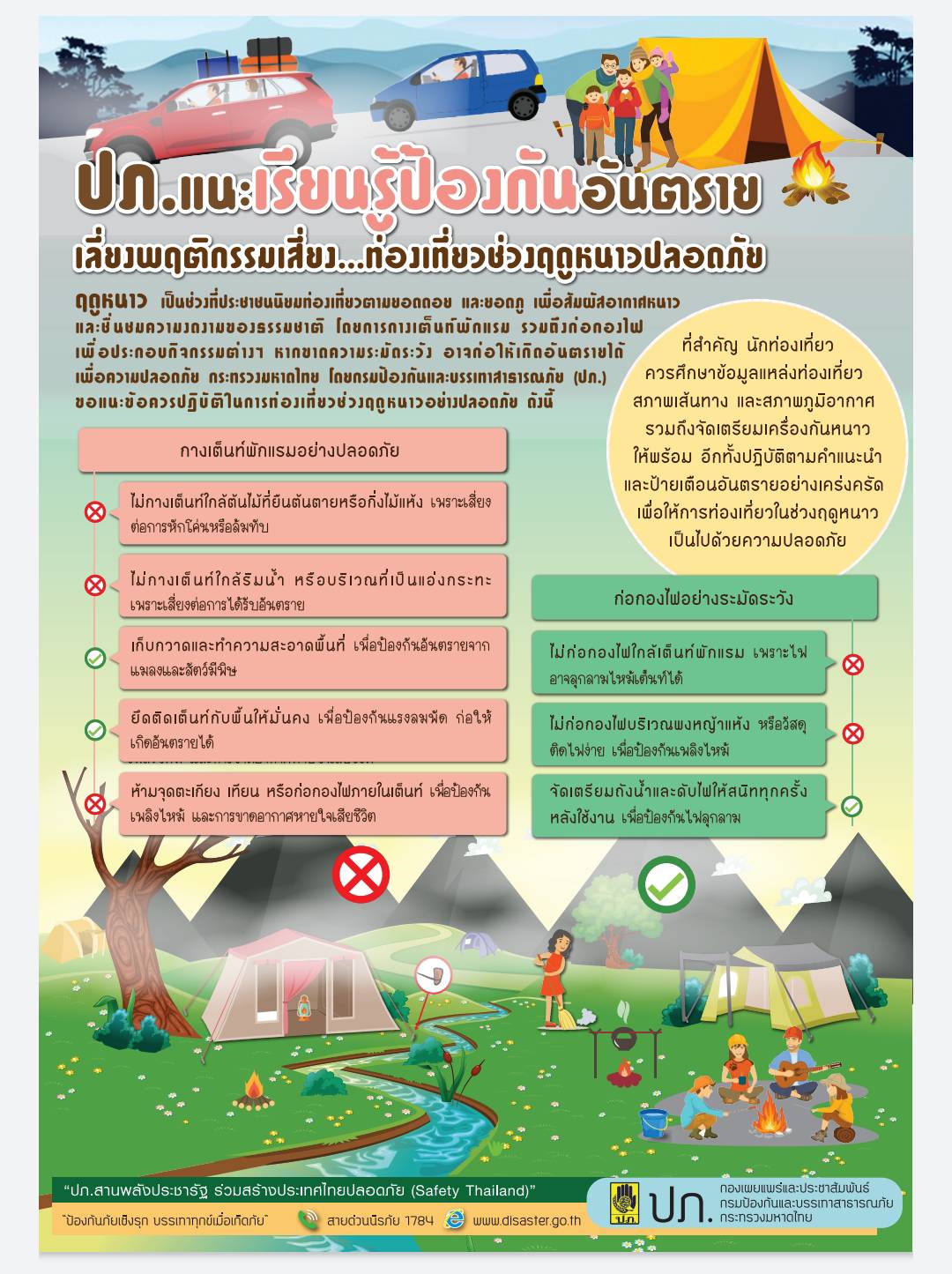 ฤดูหนาวเป็นช่วงที่ประชาชนนิยมเดินทางท่องเที่ยวตามยอดดอย และยอดภู เพื่อสัมผัสอากาศหนาวและชื่นชมความงดงามของธรรมชาติ โดยการกางเต็นท์พักแรม และก่อกองไฟเพื่อประกอบกิจกรรมต่างๆ รวมทั้งการถ่ายรูปและชมวิว หากขาดความระมัดระวัง อาจก่อให้เกิดอันตรายได้ เพื่อความปลอดภัย กระทรวงมหาดไทย โดยกรมป้องกันและบรรเทาสาธารณภัย (ปภ.) ขอแนะข้อควรปฏิบัติในการท่องเที่ยวช่วงฤดูหนาวอย่างปลอดภัย ดังนี