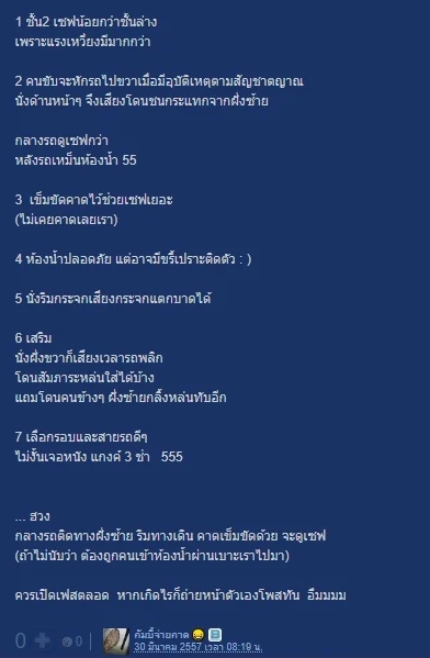 เวลาเดินทาง เคยคิดสงสัยไหมนั่งรถทัวร์ จองตรงไหน ปลอดภัยที่สุด มีวิศวกรออกแบบมาแสดงความคิด ในเว็บกระทู้ ให้ความเห็นว่า จากสถิติอุบัติเหตุ พบว่าส่วนไหนมีโอกาสรอดและบาดเจ็บน้อยที่สุด