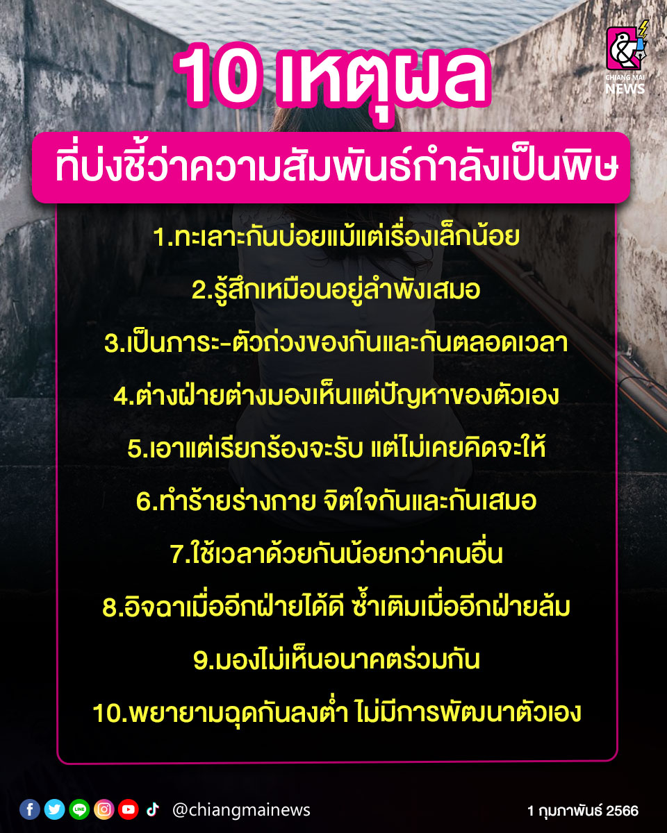 เชียงใหม่นิวส์ชวนมาดู 10 เหตุผล ที่จะบอกได้ว่า ความสัมพันธ์แต่ละรูปแบบที่คุณมีอยู่ในตอนนี้ กำลังเป็นพิษต่อคุณอยู่หรือไม่?
