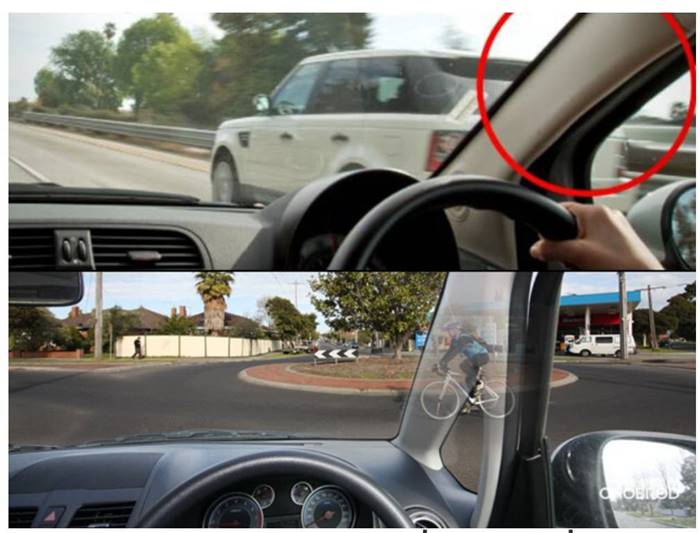 - จุดบอดมุมหน้ารถ เกิดจากมุมเสาหน้ารถระหว่างกระจกหน้าและกระจกข้าง ส่งผลให้มองไม่เห็นรถที่ขับขนานด้านข้างรถ