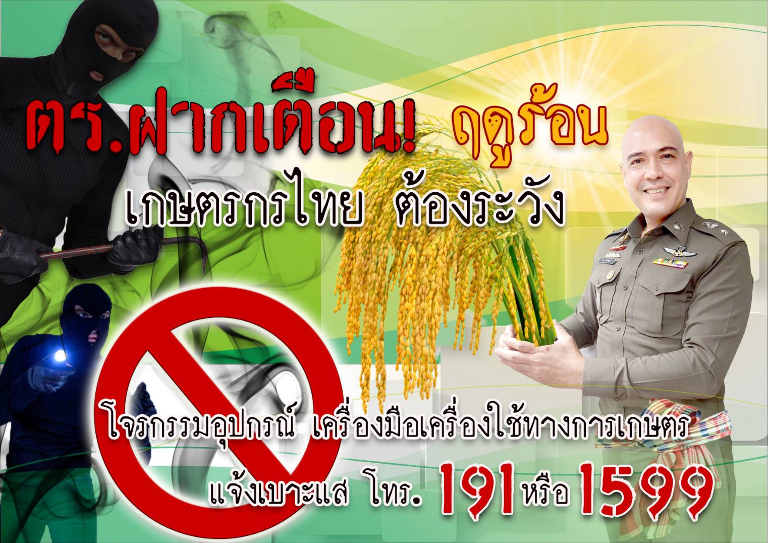 พล.อ.ประยุทธ์ จันทร์โอชา นายกรัฐมนตรี และ พล.ต.อ. ดำรงศักดิ์ กิตติประภัสร์ ผบ.ตร. มีความห่วงใยพี่น้องเกษตรกรที่จะถูกโจรกรรมเครื่องมือและอุปกรณ์การเกษตรเป็นที่เดือดร้อน โดย พ.ต.ท. ธ เทพฯ กล่าวว่า จากข้อมูลสถิติอาชญากรรมทุกปีที่ผ่านมา เมื่อเข้าสู่ช่วงฤดูร้อนที่มีสภาวะแห้งแล้ง เกษตรกรมีความจำเป็นต้องนำเครื่องมือการเกษตร เช่น เครื่องสูบน้ำ หรือรถไถขนาดเล็กพ่วงเครื่องสูบน้ำไปใช้สูบน้ำเข้าแปลงเกษตร และมักถูกโจรกรรมเป็นที่เสียหายเดือดร้อน