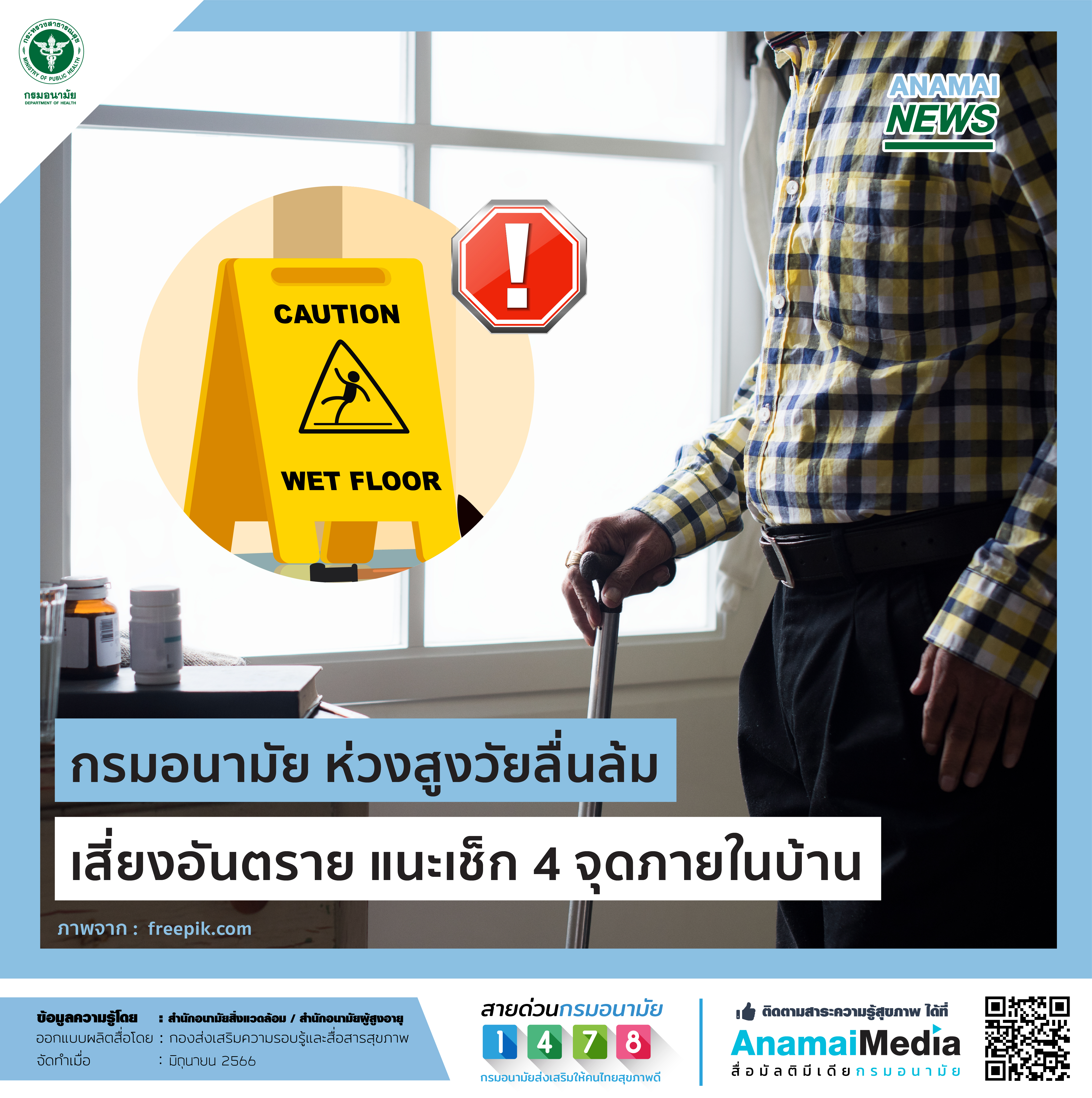 นายแพทย์สุวรรณชัย วัฒนายิ่งเจริญชัย อธิบดีกรมอนามัย กล่าวว่า การหกล้มเป็นอุบัติเหตุที่เกิดขึ้นบ่อยในผู้สูงอายุโดยเฉพาะช่วงหน้าฝน ส่งผลให้ผู้สูงอายุบาดเจ็บ ทุพพลภาพ หรืออาจถึงขั้นเสียชีวิต เนื่องจากผู้สูงอายุเป็นช่วงวัยที่มีความเสื่อมถอยของสภาพร่างกาย รวมทั้งผู้สูงอายุอาจมีโรคประจำตัว เช่น โรคเบาหวาน ความดันโลหิตสูง ที่เมื่อหกล้มแล้วจะเกิดอันตรายเพิ่มขึ้นได้ กรมอนามัยจึงขอให้ครอบครัวที่มีผู้อายุอยู่ภายในบ้านควรจัดการสภาพแวดล้อมรอบตัวผู้สูงอายุให้สะอาดปลอดภัยได้ และเอื้อต่อการดำเนินชีวิตประจำวัน รวมทั้งตรวจสอบ 4 จุดสำคัญภายในบ้าน คือ 1) พื้นบ้าน พื้นบ้านที่ลื่น ด้วยสาเหตุเพราะเปียกน้ำ หรือพื้นมันวาว เป็นอุบัติเหตุส่วนใหญ่ของผู้สูงอายุ ดังนั้นจึงควรเลือกพื้นกระเบื้องเรียบ ที่ไม่ลื่น ไม่มันวาว มีความหนืด เพื่อป้องกันการหกล้มรวมทั้งเมื่อฝนตก หรือมีน้ำหกบริเวณพื้นบ้าน อย่าปล่อยทิ้งไว้เด็ดขาด ให้รีบหาผ้ามาเช็ดทำความสะอาดให้แห้งทันที ระวังพื้นบ้านต่างระดับ และควรจัดวางของให้เป็นระเบียบ เพื่อให้ผู้สูงอายุไม่สะดุดและเดินได้สะดวก 2) พื้นห้องครัว ห้องครัวเป็นบริเวณบ้านที่ผู้สูงอายุจะเข้าไปบ่อย เพราะเป็นพื้นที่สำหรับประกอบอาหาร ทำให้พื้นกระเบื้องมีความมันและเสี่ยงต่อการลื่นล้มได้ง่าย จึงควรหมั่นทำความสะอาดคราบมันบริเวณพื้นกระเบื้องให้สะอาด ที่สำคัญควรเก็บของมีคมให้อยู่ในที่ปลอดภัย