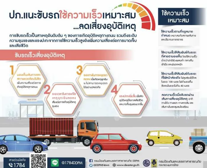 การขับรถเร็วเป็นสาเหตุของการเกิดอุบัติเหตุทางถนนในลำดับต้น ๆ ทำให้เกิดการบาดเจ็บรุนแรงและเสียชีวิต กระทรวงมหาดไทย โดยกรมป้องกันและบรรเทาสาธารณภัย (ปภ.) จึงขอแนะสาระน่ารู้เกี่ยวกับการใช้ความเร็วในการขับรถอย่างปลอดภัย ดังนี้