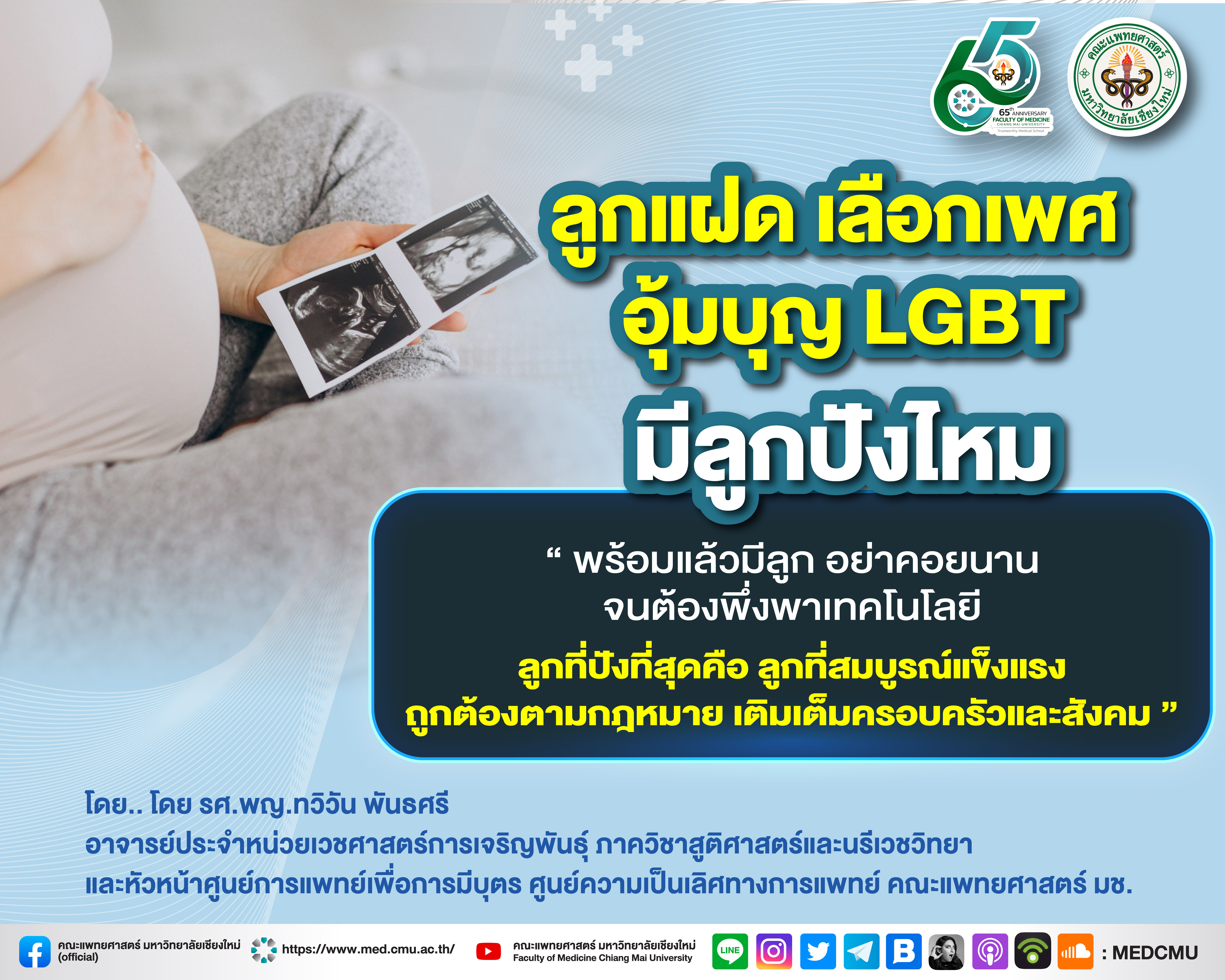 ขอขอบคุณข้อมูลจาก : รศ.พญ.ทวิวัน พันธศรี อาจารย์ประจำหน่วยเวชศาสตร์การเจริญพันธุ์ ภาควิชาสูติศาสตร์และนรีเวชวิทยา และหัวหน้าศูนย์การแพทย์เพื่อการมีบุตร ศูนย์ความเป็นเลิศทางการแพทย์ คณะแพทยศาสตร์ มช.