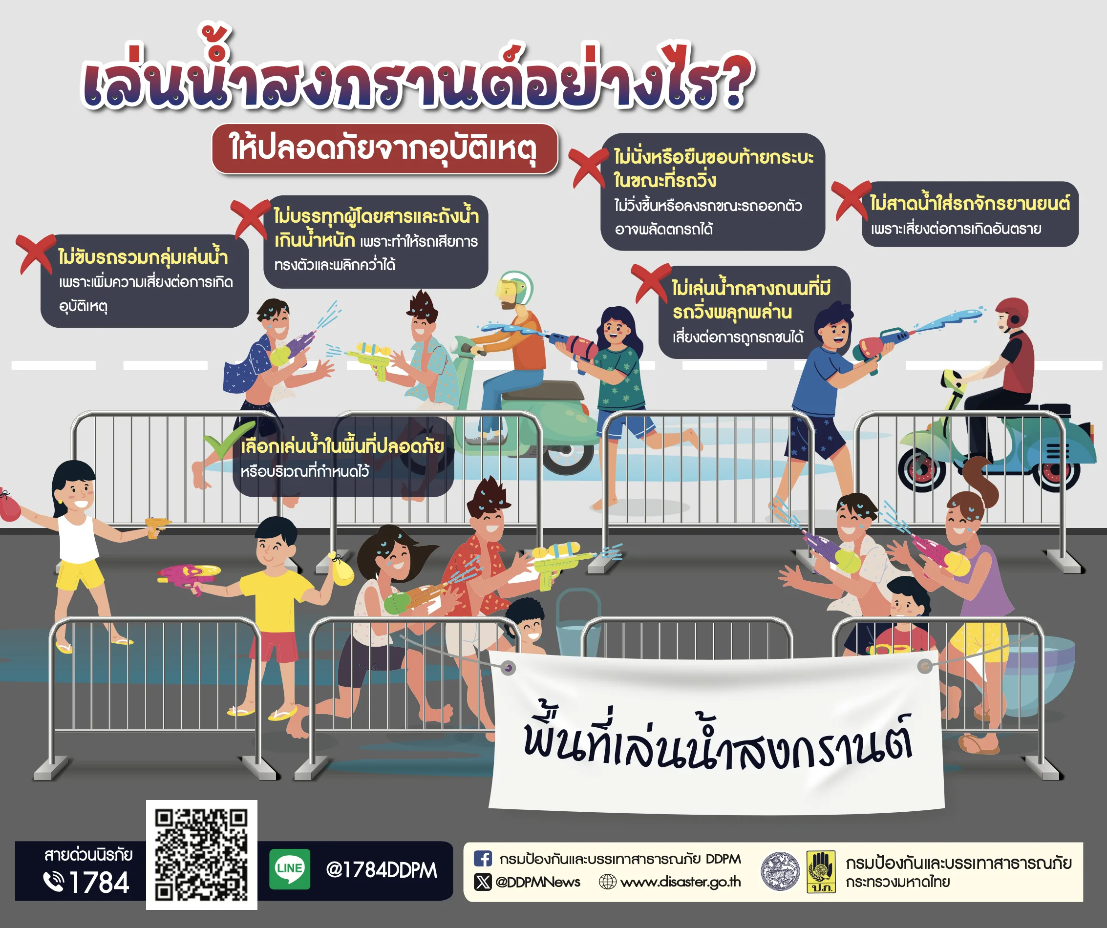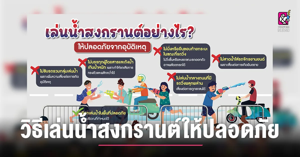 กรมป้องกันและบรรเทาสาธารณภัย (ปภ.) แนะข้อควรปฏิบัติการป้องกันอุบัติเหตุจากการเล่นน้ำสงกรานต์ ผู้ขับรถเล่นน้ำในช่วงเทศกาลสงกรานต์ต้องเพิ่มความระมัดระวังในการขับขี่เป็นพิเศษ ให้ลดความเร็วเมื่อผ่านเส้นทางที่มีการเล่นน้ำ ไม่เร่งหรือหยุดรถกะทันหัน ไม่บรรทุกคนหรือถังน้ำจนเกินพิกัดน้ำหนักที่กำหนด หลีกเลี่ยงการนั่งหรือยืนขอบท้ายรถกระบะอย่างเด็ดขาด ไม่ขี่รถจักรยานยนต์รวมกลุ่มกันเล่นน้ำเพราะเสี่ยงรถเสียหลักลื่นล้มได้ อีกทั้งไม่เล่นน้ำในลักษณะเสี่ยงอันตราย อาทิ สาดน้ำใส่รถจักรยานยนต์ เล่นน้ำบนถนน เพื่อป้องกันการเกิดอุบัติเหตุทางถนนจากการเล่นน้ำสงกรานต์