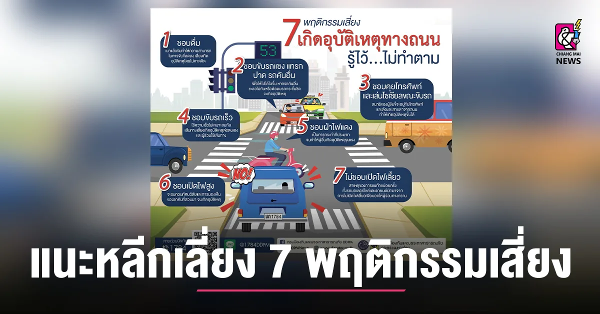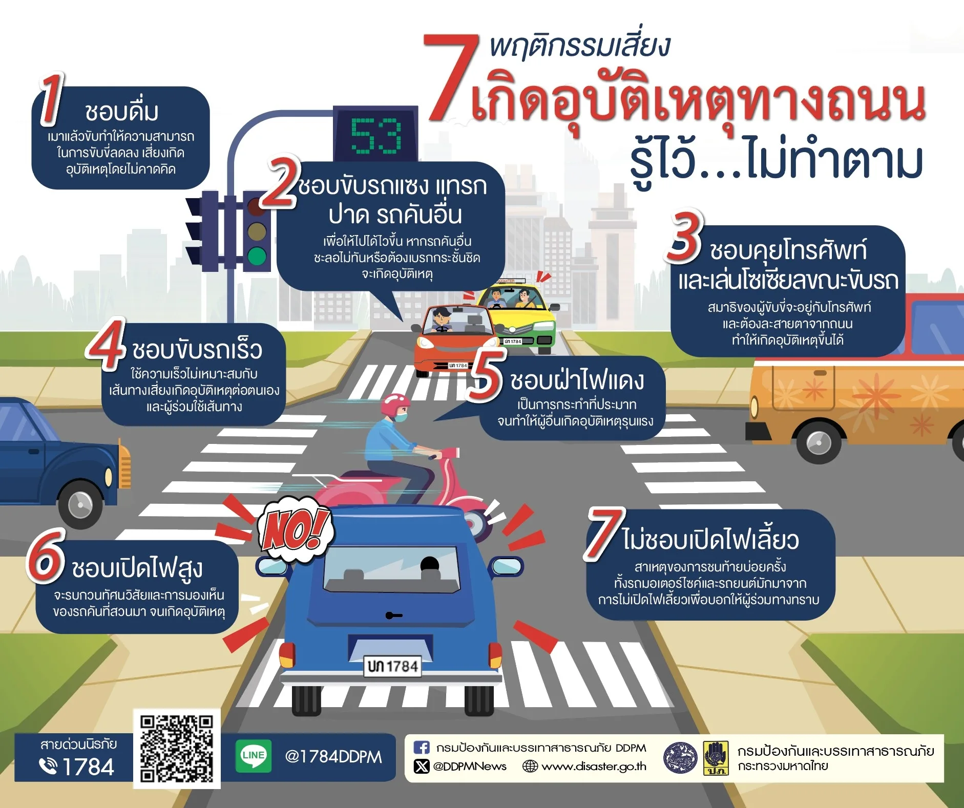 กรมป้องกันและบรรเทาสาธารณภัย ขอแนะการขับขี่ปลอดภัยห่างไกลอุบัติเหตุด้วยการเลี่ยง 7 พฤติกรรมเสี่ยงขณะขับรถ ดังนี้ 1.ดื่มแล้วขับ เครื่องดื่มแอลกอฮอล์มีฤทธิ์กดประสาทตอบสนองช้ากว่าปกติ การคาดคะเนและกะระยะห่างจากรถคันอื่นผิดพลาด ทำให้ความสามารถในการขับรถลดลง จึงไม่สามารถแก้ไขเหตุฉุกเฉินเฉพาะหน้าได้อย่างปลอดภัย 2.ขับรถเร็ว ทำให้การมองเห็นเส้นทางลดลงเมื่อเกิดเหตุฉุกเฉินจึงไม่สามารถควบคุมรถได้อย่างปลอดภัย เพราะต้องใช้ระยะทางในการหยุดรถมากกว่าปกติ โดยเฉพาะหากเกิดอุบัติเหตุแรงปะทะ ณ จุดเกิดเหตุจะเพิ่มขึ้นตามระดับความเร็วทำให้เกิดอุบัติเหตุในลักษณะรุนแรง 3. การแซงปาดหน้าในระยะกระชั้นชิด เนื่องจากรถคันที่ตัดหน้าเปลี่ยนเลนในระยะไม่ปลอดภัย ทำให้รถคันอื่นชะลอไม่ทันหรือต้องเบรกกะทันหันจะเกิดอุบัติเหตุเฉี่ยวชน 4. ชอบฝ่าไฟแดง อาจเกิดการเฉี่ยวชนหรือชนประสานงากับรถที่ขับมาจากช่องทางอื่นเป็นการกระทำที่ประมาทจนทำให้ผู้อื่นเกิดอุบัติเหตุรุนแรง 5. ชอบคุยโทรศัพท์และเล่นโซเซียลขณะขับรถ ทำให้ผู้ขับขี่เสียสมาธิและต้องละสายตาจากเส้นทางส่งผลต่อประสิทธิภาพในการขับรถลดลง จึงเพิ่มความเสี่ยงเกิดอุบัติเหตุมากกว่าปกติ 2- 4 เท่า 6. ไม่ชอบเปิดไฟ เป็นสาเหตุของการชนท้ายบ่อยครั้งทั้งรถมอเตอร์ไซค์และรถยนต์มักมาจากการไม่เปิดไฟเลี้ยวเพื่อบอกให้ผู้ร่วมทางทราบ ควรเปิดไฟเลี้ยวก่อน 30 เมตร เพื่อความปลอดภัย 7. ชอบเปิดไฟสูง พฤติกรรมเสี่ยงที่รบกวนทัศนวิสัยและการมองเห็นของรถคันที่สวนมาจนเกิดอุบัติเหตุ ควรใช้ไฟสูงเปิดในสถานการณ์จำเป็นเท่านั้น เช่น เวลาฝนตกหนักหรือเวลาที่ขับรถในที่มืด ไม่มีแสงไฟ เป็นต้น