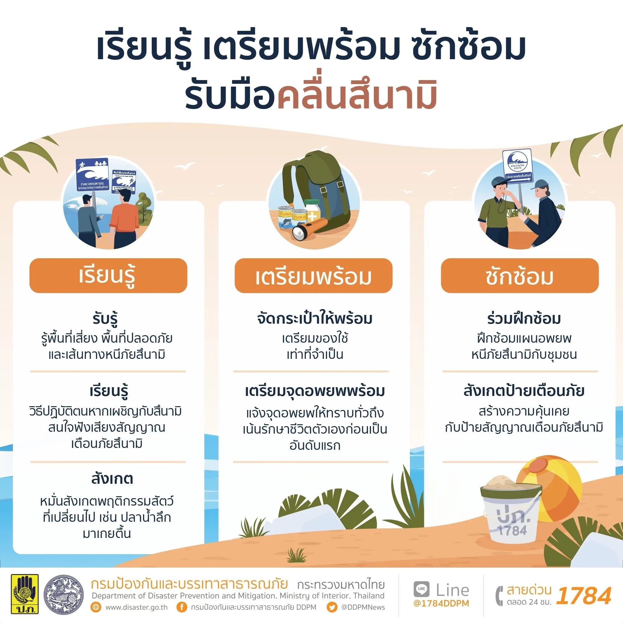 นายภาสกร บุญญลักษม์ อธิบดีกรมป้องกันและบรรเทาสาธารณภัย (ปภ.) เปิดเผยว่า คลื่นสึนามิเป็นภัยพิบัติที่เกิดจากการเคลื่อนตัวของแผ่นเปลือกโลกใต้มหาสมุทรอย่างฉับพลัน ทำให้น้ำทะเลก่อตัวเป็นคลื่นขนาดใหญ่ และซัดถล่มพื้นที่ชายฝั่งอย่างรุนแรง ก่อให้เกิดความเสียหายเป็นบริเวณกว้าง กรมป้องกันและบรรเทาสาธารณภัย (ปภ.) ขอแนะข้อควรรู้และวิธีรับมือคลื่นสึนามิ ดังนี้ ตรวจสอบสภาพความเสี่ยงภัยสึนามิในพื้นที่ อาทิ ระยะห่างและความสูงจากระดับน้ำทะเลของบ้าน โรงเรียน สถานที่ทำงาน สถานที่เกี่ยวข้อง เพื่อเป็นข้อมูลในการวางแผนอพยพได้อย่างปลอดภัย รู้รับมือคลื่นสึนามิอย่างถูกวิธี ศึกษาและจดจำเส้นทางอพยพที่ใกล้ที่สุด พร้อมเรียนรู้ความหมายของป้ายสัญลักษณ์และเสียงสัญญาณเตือนภัย รวมถึงเข้าร่วมฝึกซ้อมการแจ้งเตือนภัยและอพยพหนีภัยสึนามิ เพื่อให้มีทักษะรู้รอดปลอดภัยจากสึนามิ จัดเตรียมสิ่งของไว้ใช้ยามฉุกเฉิน และจัดเก็บไว้ในจุดที่สามารถนำไปใช้งานได้ทันที สังเกตความผิดปกติทางธรรมชาติ อาทิ แผ่นดินไหวใต้มหาสมุทร น้ำทะเลลดลงอย่างรวดเร็วมีฝูงสัตว์น้ำจำนวนมากใกล้ชายฝั่ง ติดตามข้อมูลข่าวสารสถานการณ์ภัย หากมีประกาศแจ้งเตือนภัยคลื่นสึนามิให้อพยพไปยังพื้นที่ปลอดภัยทันที พร้อมปฏิบัติตามคำแนะนำของทางราชการอย่างเคร่งครัด