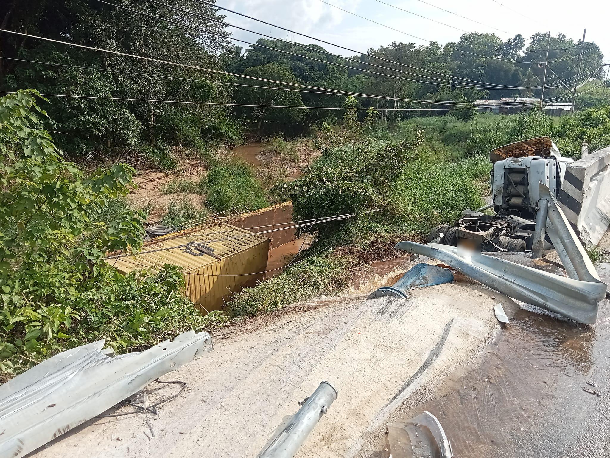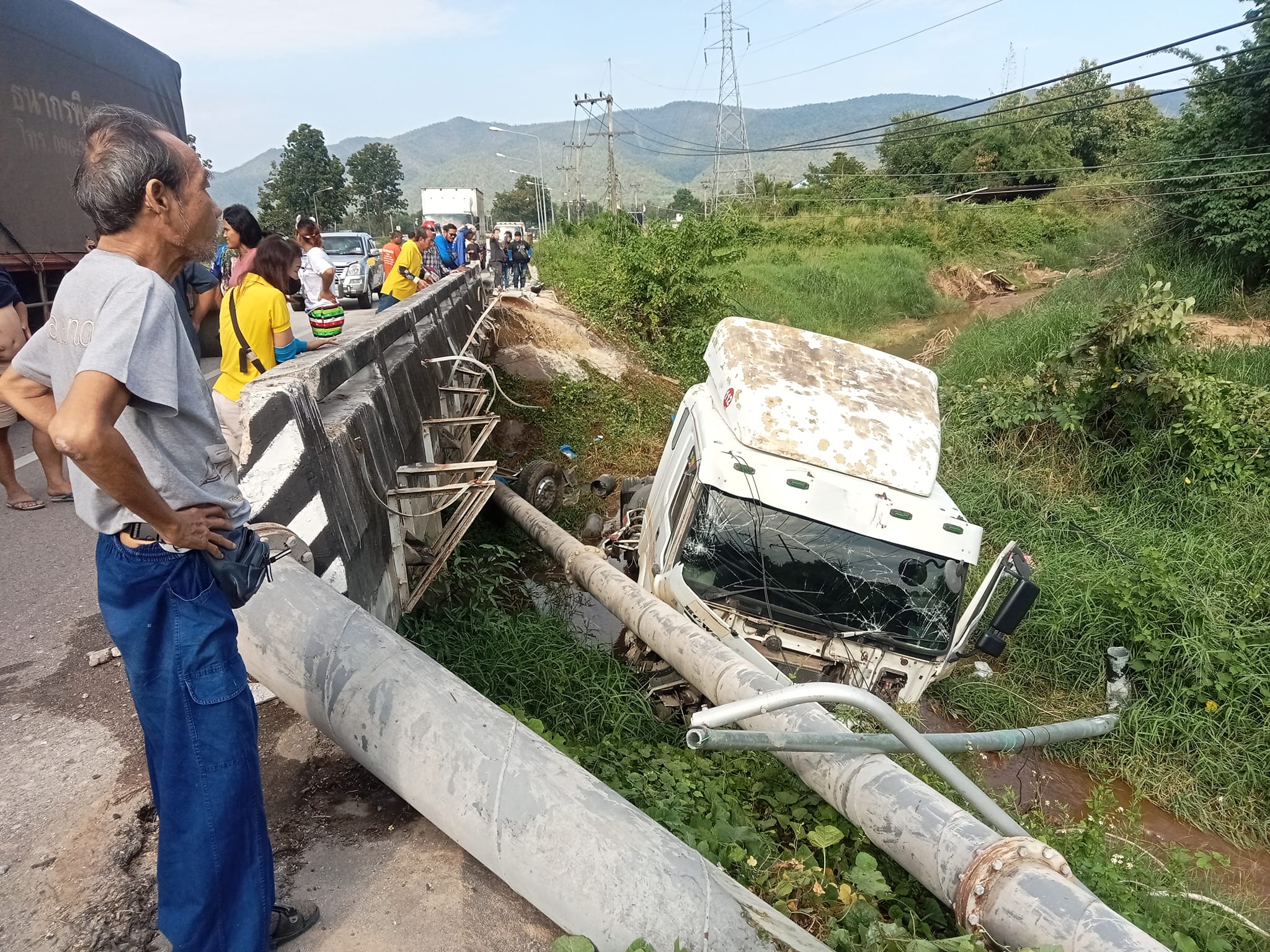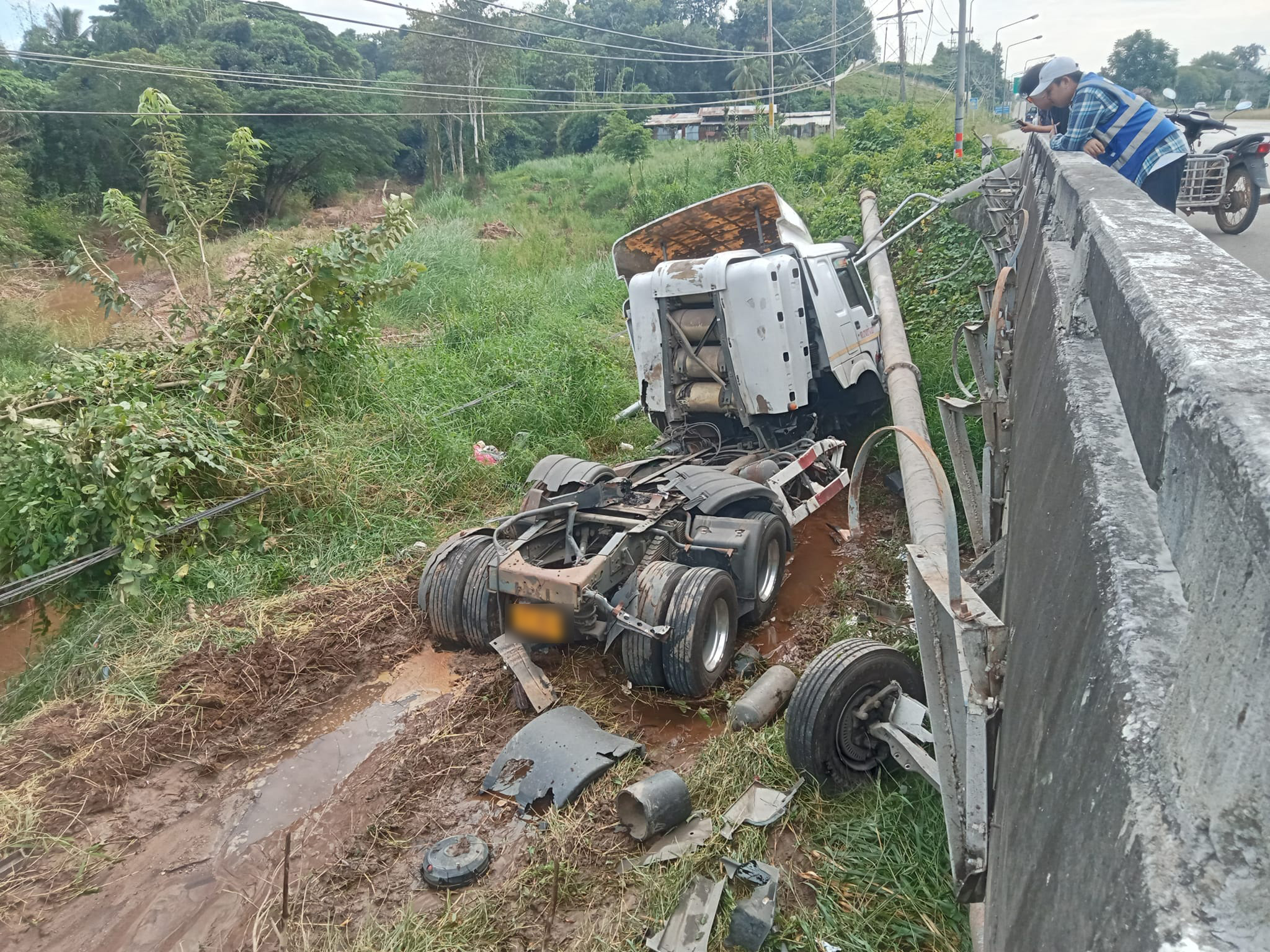 โชเฟอร์หนุ่มใหญ่ขับเทรลเลอร์ เสียหลักพุ่งตกสะพานรถพังยับ เคราะห์ดีได้รับบาดเจ็บเล็กน้อย