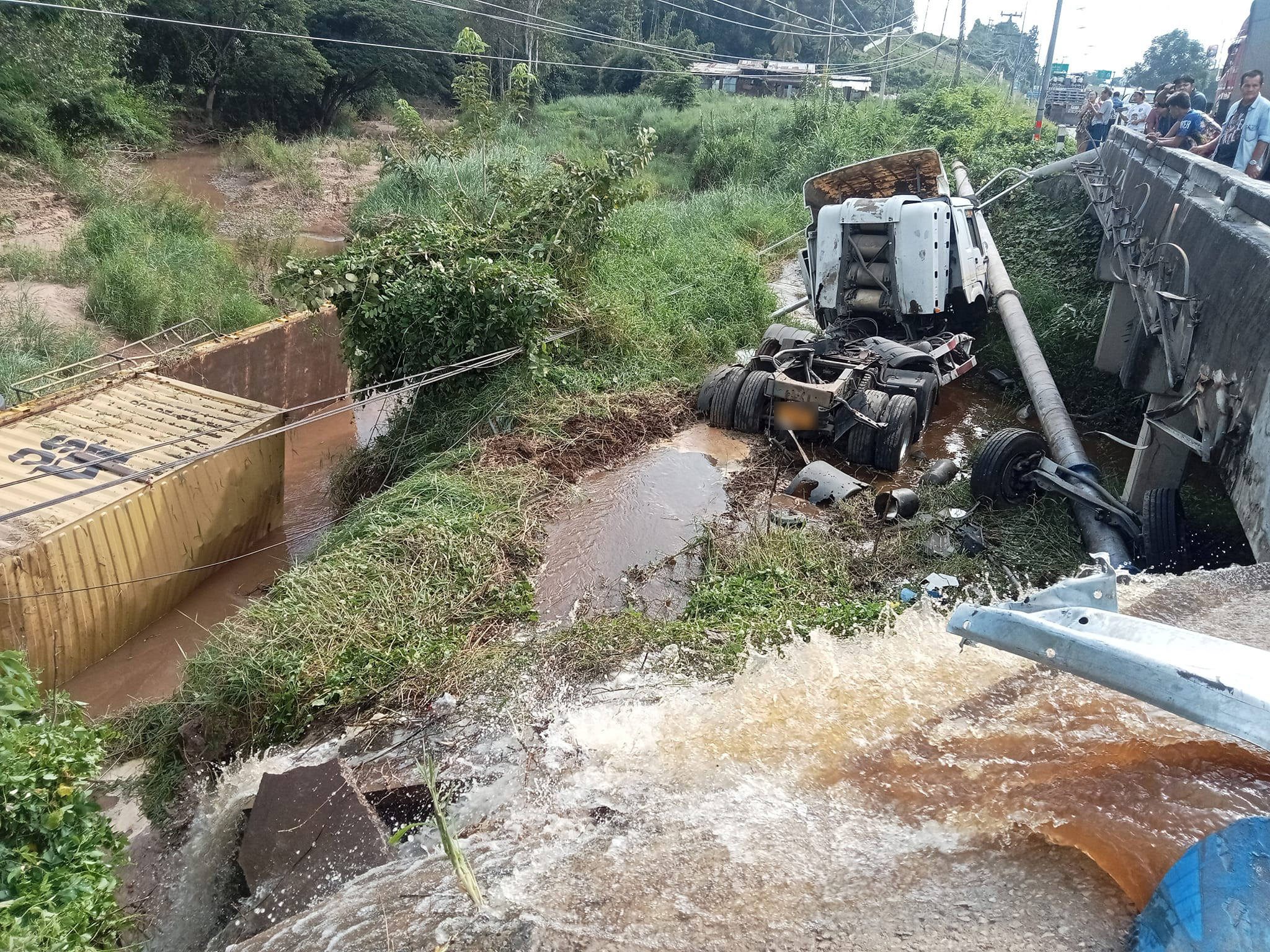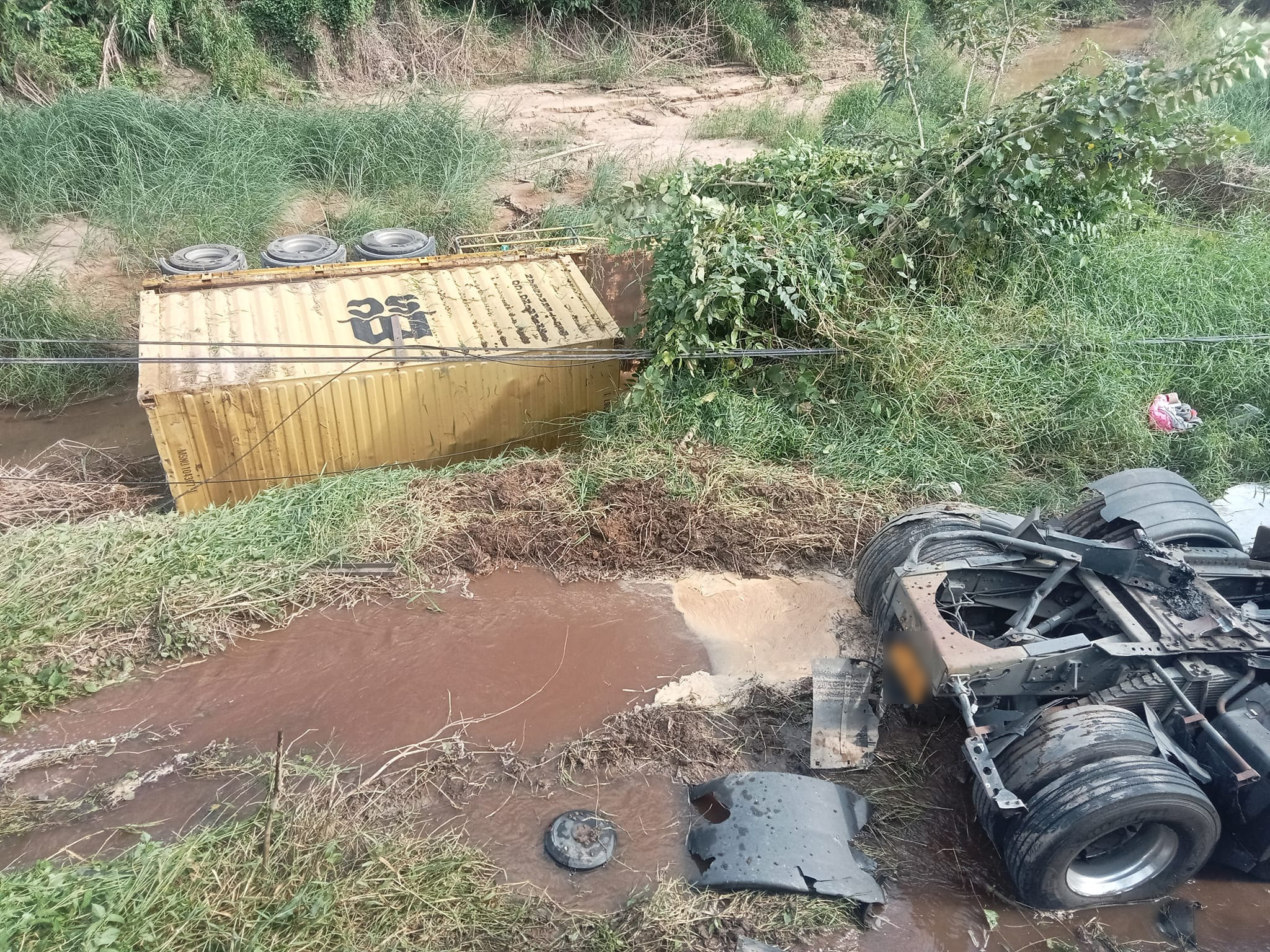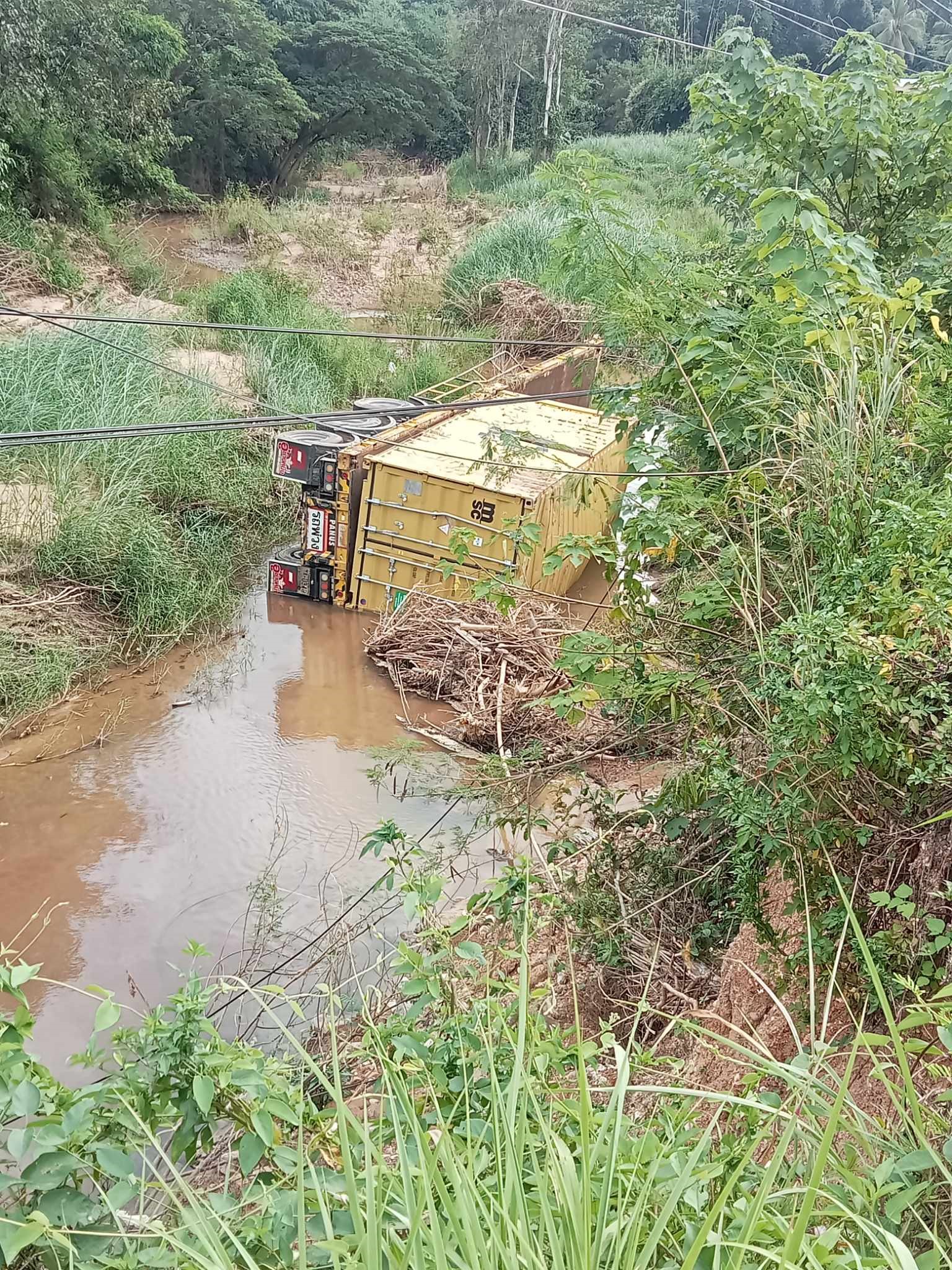 โชเฟอร์หนุ่มใหญ่ขับเทรลเลอร์ เสียหลักพุ่งตกสะพานรถพังยับ เคราะห์ดีได้รับบาดเจ็บเล็กน้อย