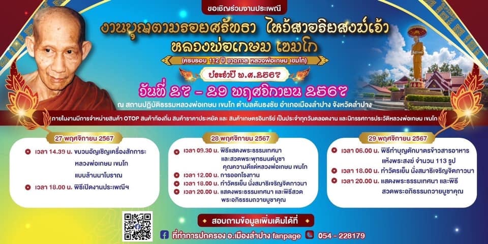 จึงขอเชิญชวนชาวลำปางและจังหวัดใกล้เคียง นักท่องเที่ยว ตลอดจนศิษยานุศิษย์ของหลวงพ่อเกษม เขมโก ได้เดินทางมากราบสักการะหลวงพ่อเกษม เขมโก ผู้ที่ชาวลำปางและชาวไทยต่างกราบไหว้ และยกย่องว่าเป็นอริยสงฆ์แห่งล้านนา ในวันที่ 27 – 29 พฤศจิกายน 2567 นี้