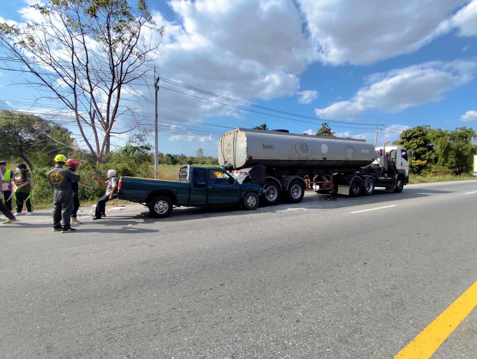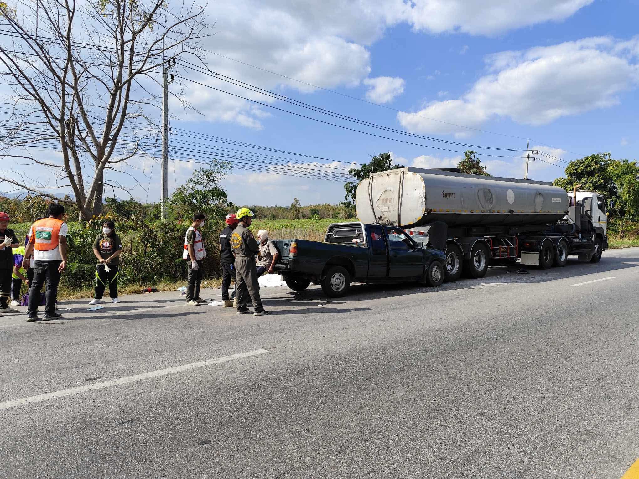 ผู้สูงอายุ 4 คน ชาว ต.ปงยางคก อ.ห้างฉัตร พากันขับรถกระบะ คาดกลับบ้าน อ.ห้างฉัตร เกิดเหตุชนท้ายรถบรรทุกพ่วง ดับ 2 เจ็บ 2