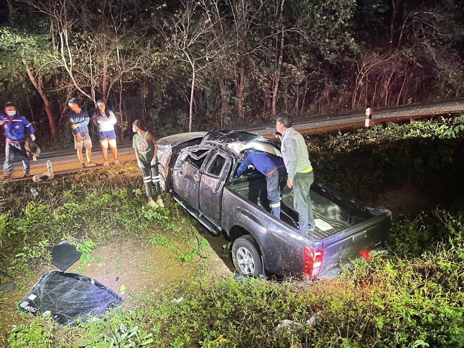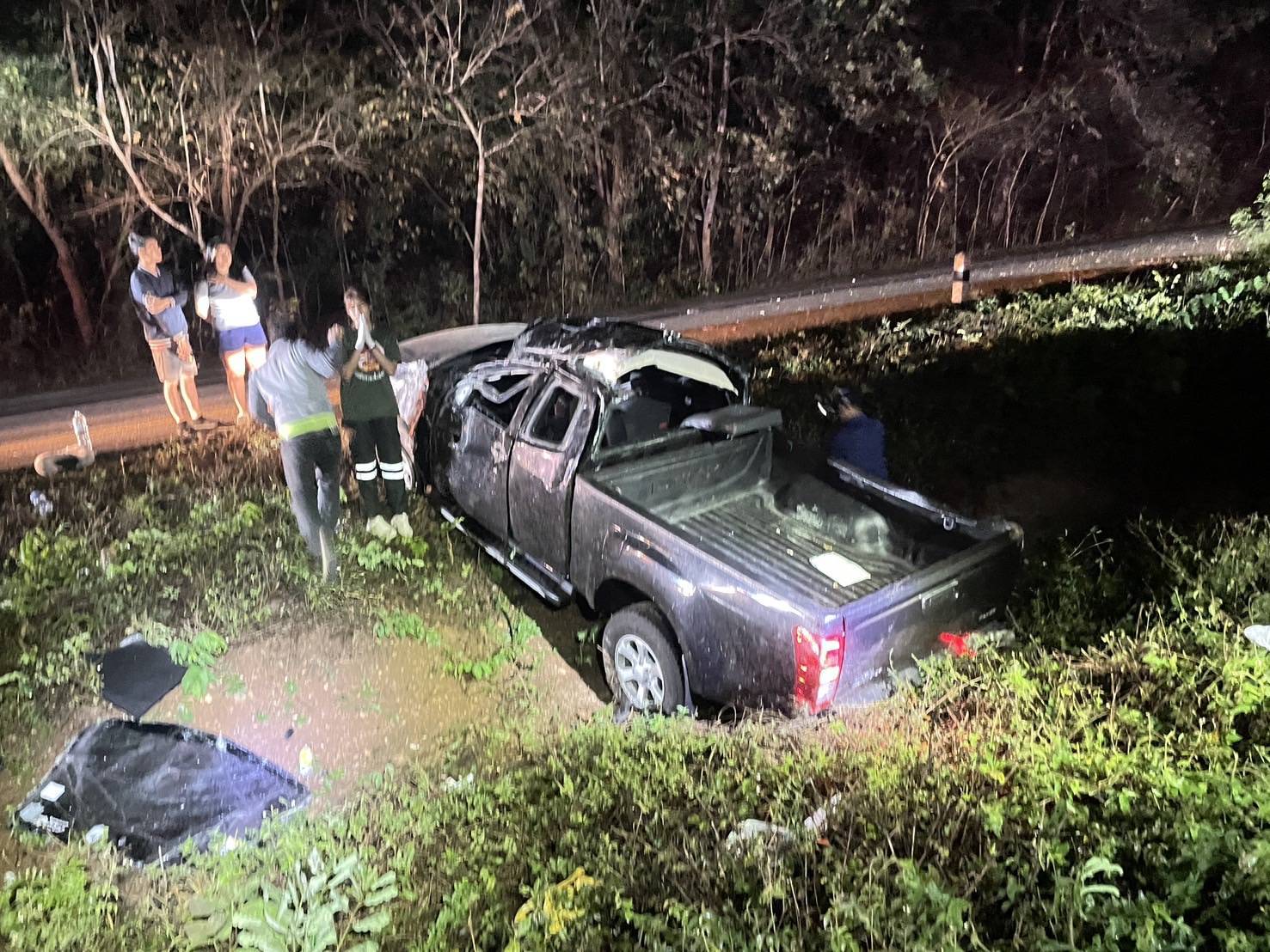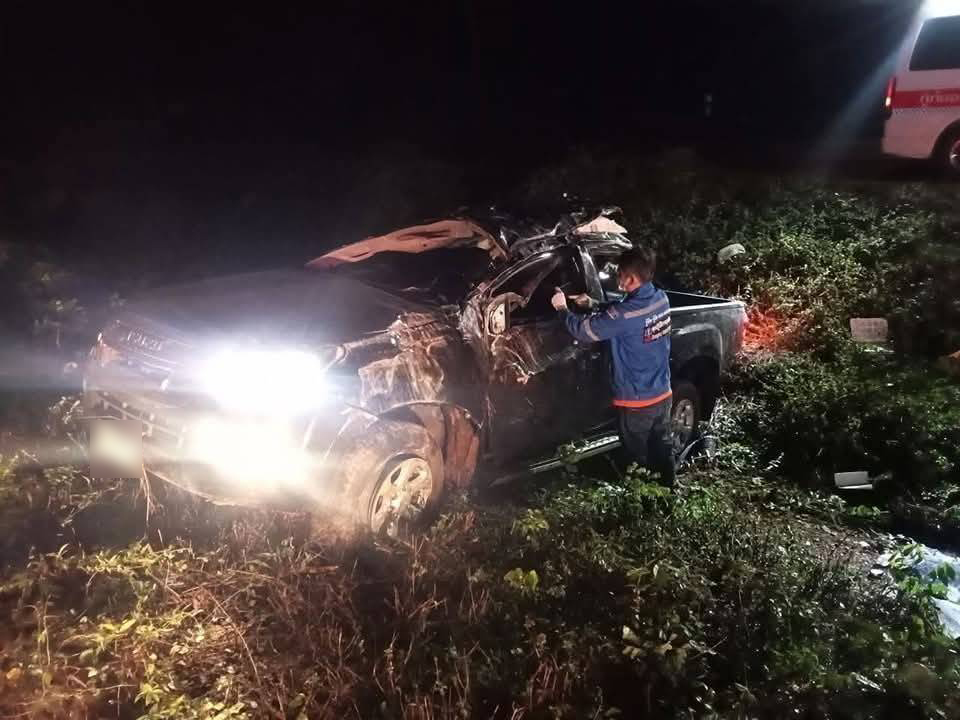 4 หนุ่มขับรถกระบะไปเชียงใหม่ ระหว่างทางมีฝนตกต่อเนื่อง เกิดเสียหลักพลิกคว่ำตกร่องกลางถนน ดับ 1 เจ็บ 3
