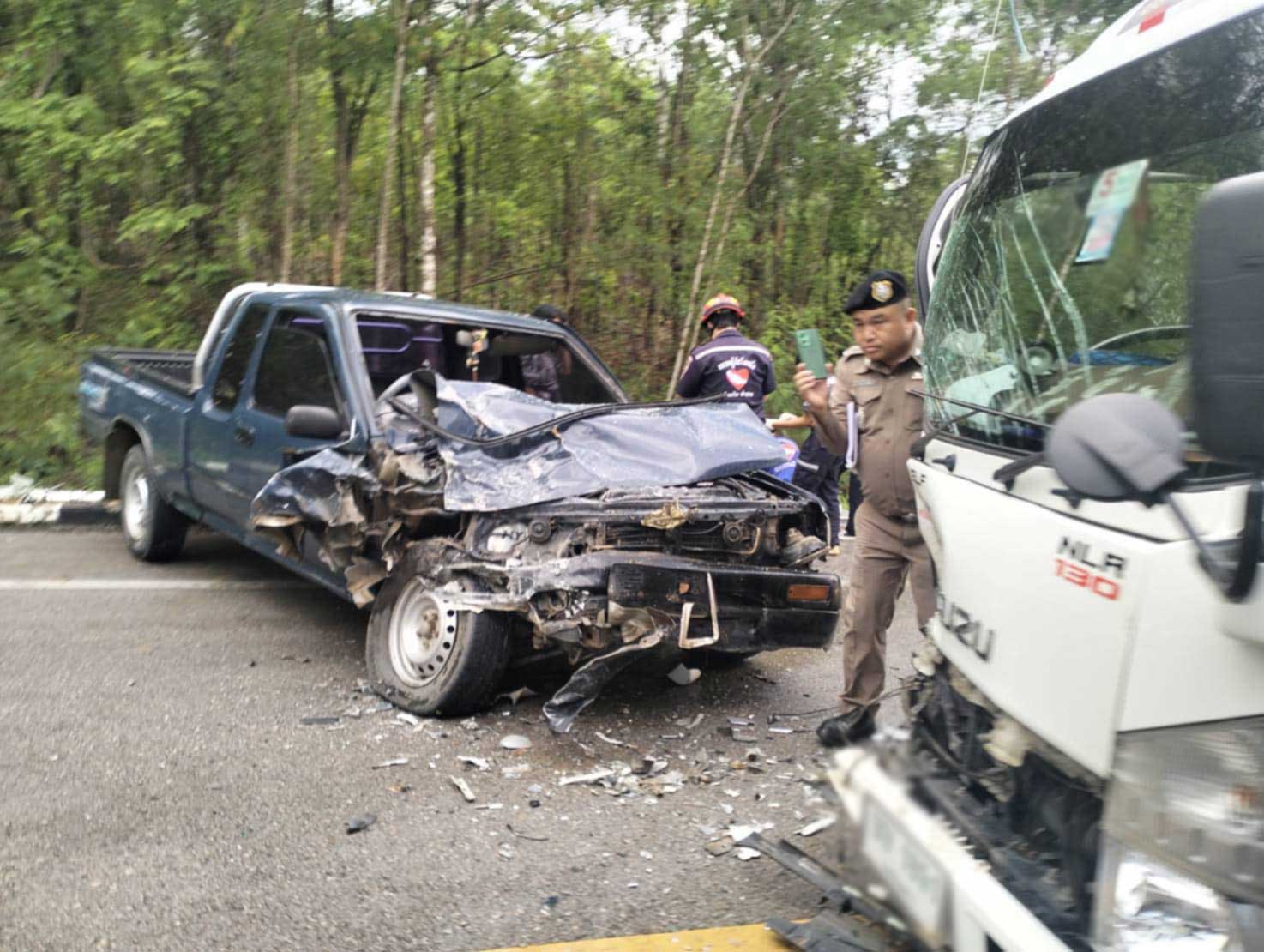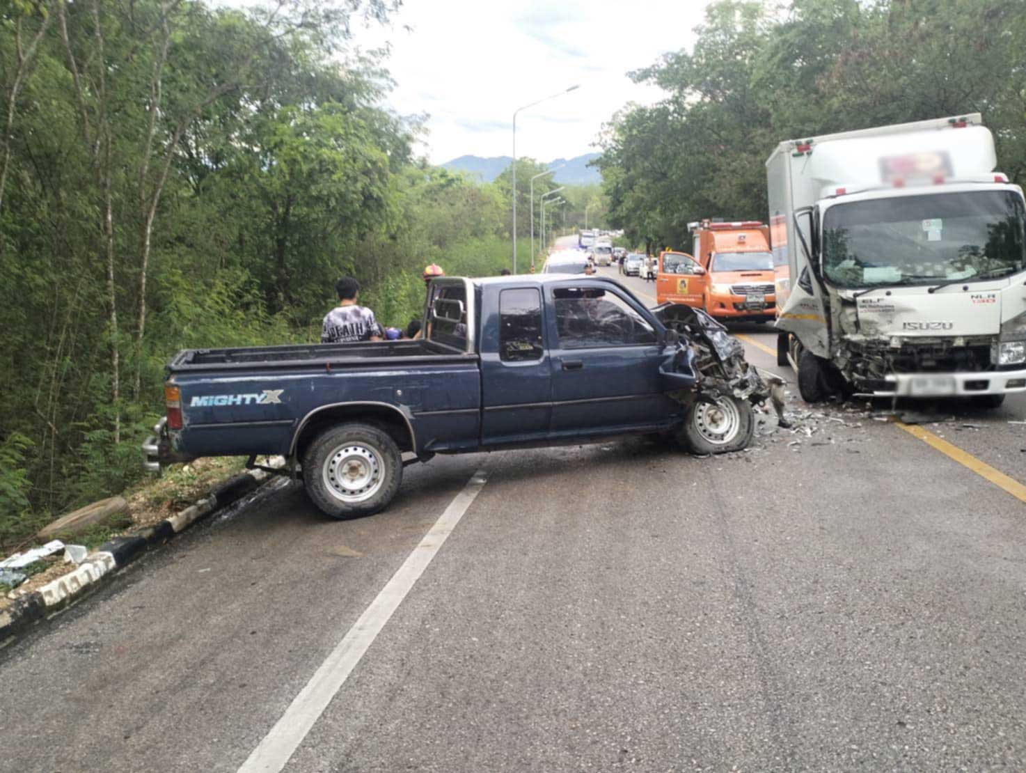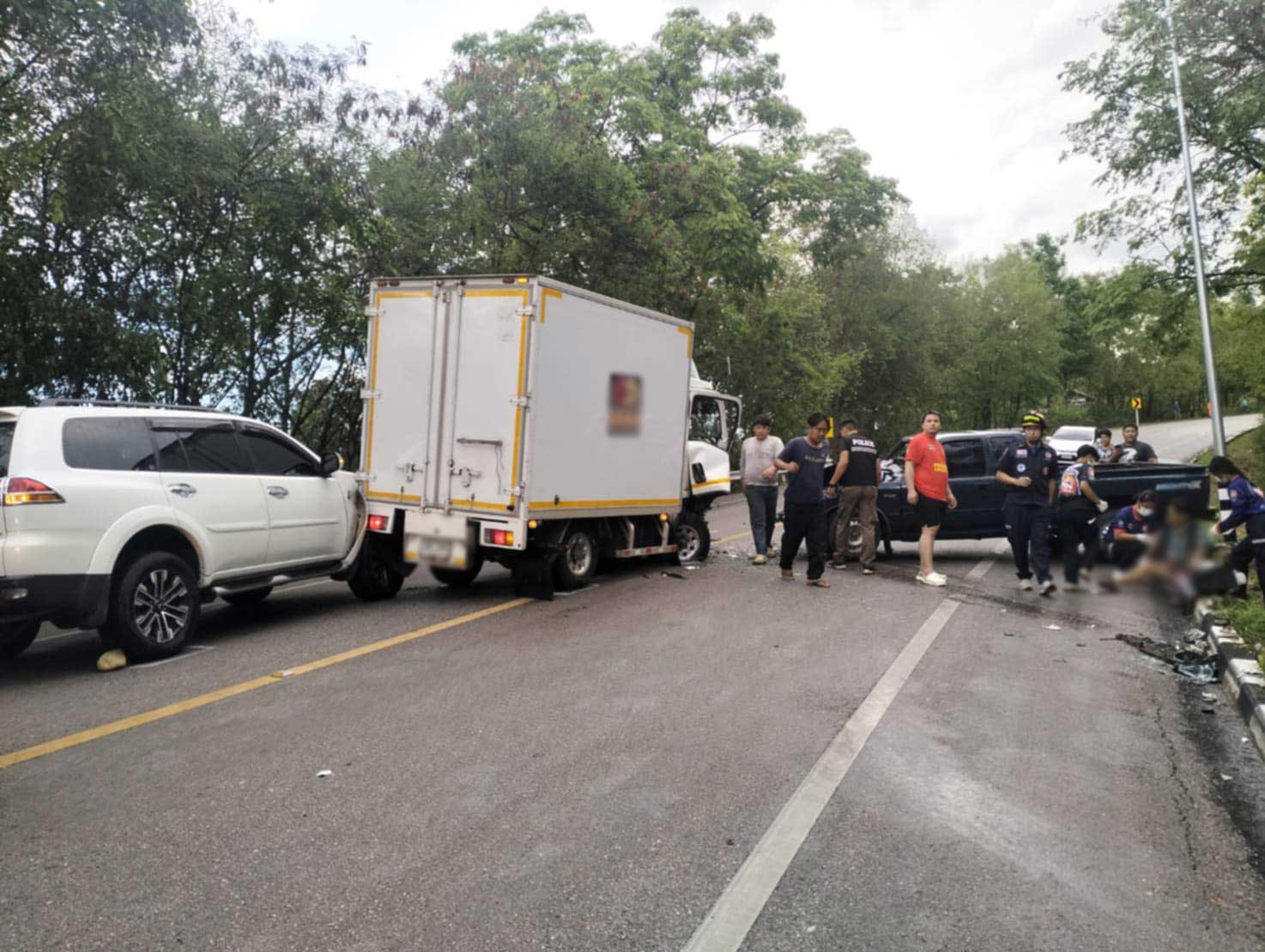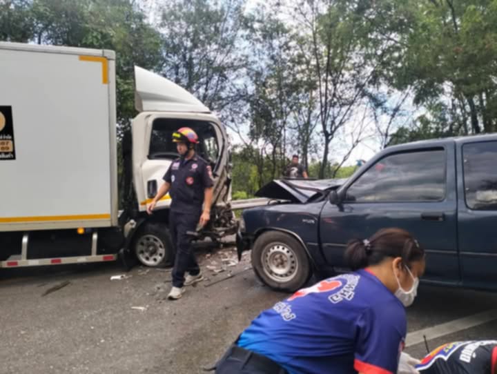 หกล้อตู้ทึบแซงรถยนต์จอดเสียกลางถนน เจอกระบะขับสวนทางลงเนินมา หลบกันไม่ทันชนกัน 3 คันรวด เจ็บ 2 ราย