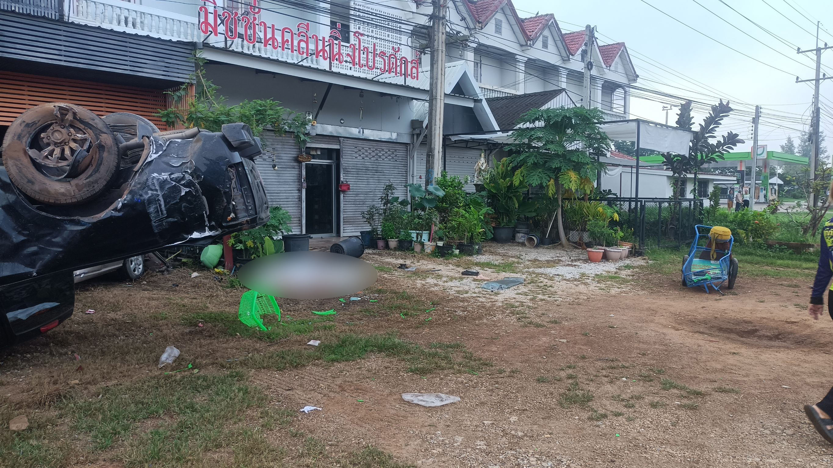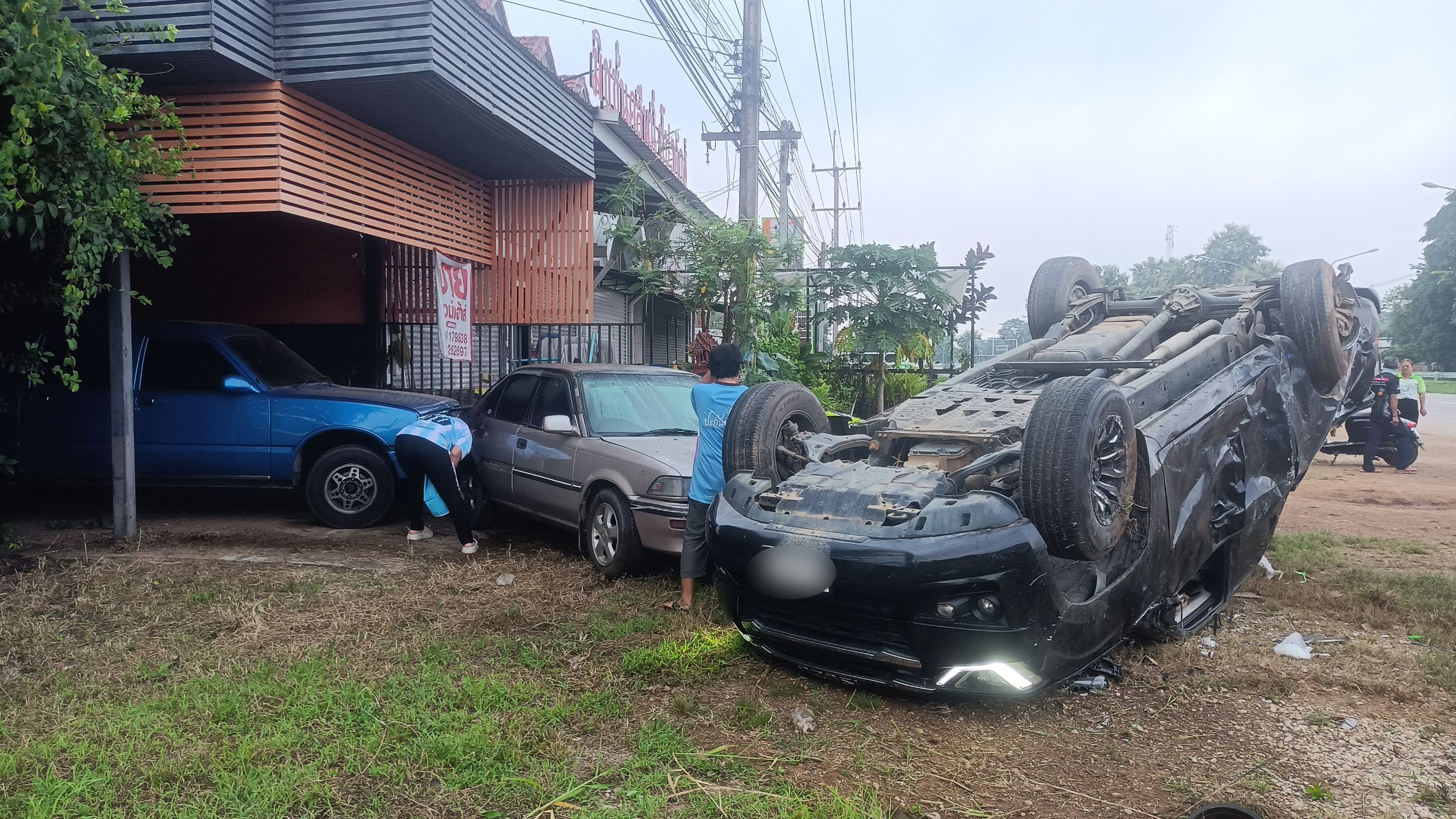 ในที่เกิดเหตุพบรถยนต์กระบะอีซูซุ สีดำ ป้ายทะเบียนจังหวัดลำปาง เสียหลักชนหลักป้ายสัญญาณไฟจุดกลับรถ ก่อนจะพลิกหงายล้อชี้ฟ้า ไถลไปไกลกว่า 80 เมตร พุ่งชนรถยนต์ชาวบ้านที่จอดอยู่เสียหายไป 2 คัน นอกจากนี้ใกล้กันพบร่าง พระบุญสม อายุ 69 ปี ชาว อำเภอบางประหัน จังหวัดพระนครศรีอยุทธยา แต่มาจำพรรษาที่วัดแห่งหนึ่งใกล้ที่เกิดเหตุ มาแล้ว 5 ปี (วัดโบสถ์ฆ้องคำ ม.2 ต.ศาลา.อ.เกาะคา)เสียชีวิตในสภาพร่างกายกระดูกหักหลายแห่ง บาตรพระกระเด็นไปไกลกว่า 20 เมตร รถเข็นที่ใช้บิณฑบาตพังเสียหาย นอกจากนี้บริเวณหน้าตึกอาคารใกล้ที่เกิดเหตุ ก็ได้รับความเสียหายไปด้วยส่วนหนึ่ง
