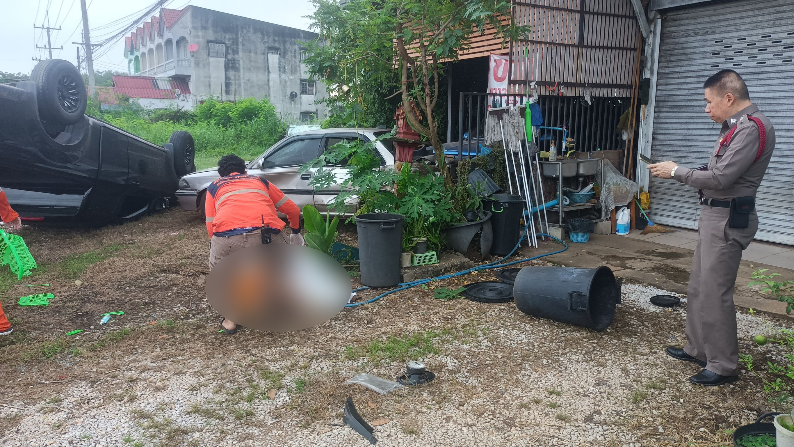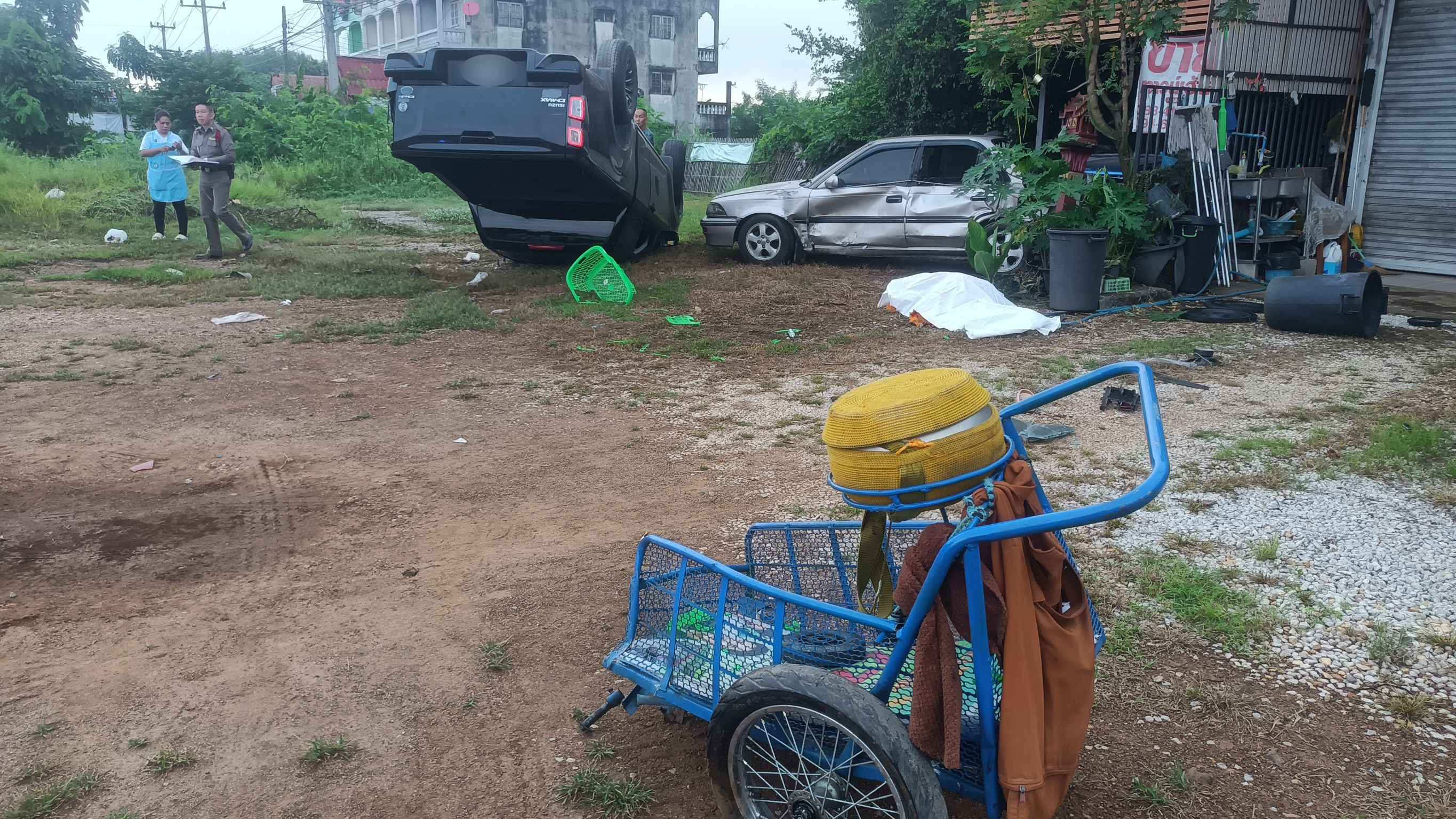 สลดใจ ตุ๊ลุงเข็นรถเข็นออกบิณฑบาตเดินริมถนน ถูกกระบะเสียหลักพุ่งเข้าชนอย่างจัง มรณภาพ รถยนต์ชาวบ้านจอดหน้าบ้านพังไปอีก 2 คัน ส่วนคนขับ เจ้าหน้าที่ตำรวจตรวจวัดปริมาณแอลกอฮอล์สูงถึง 221 มิลลิกรัมเปอร์เซ็นต์