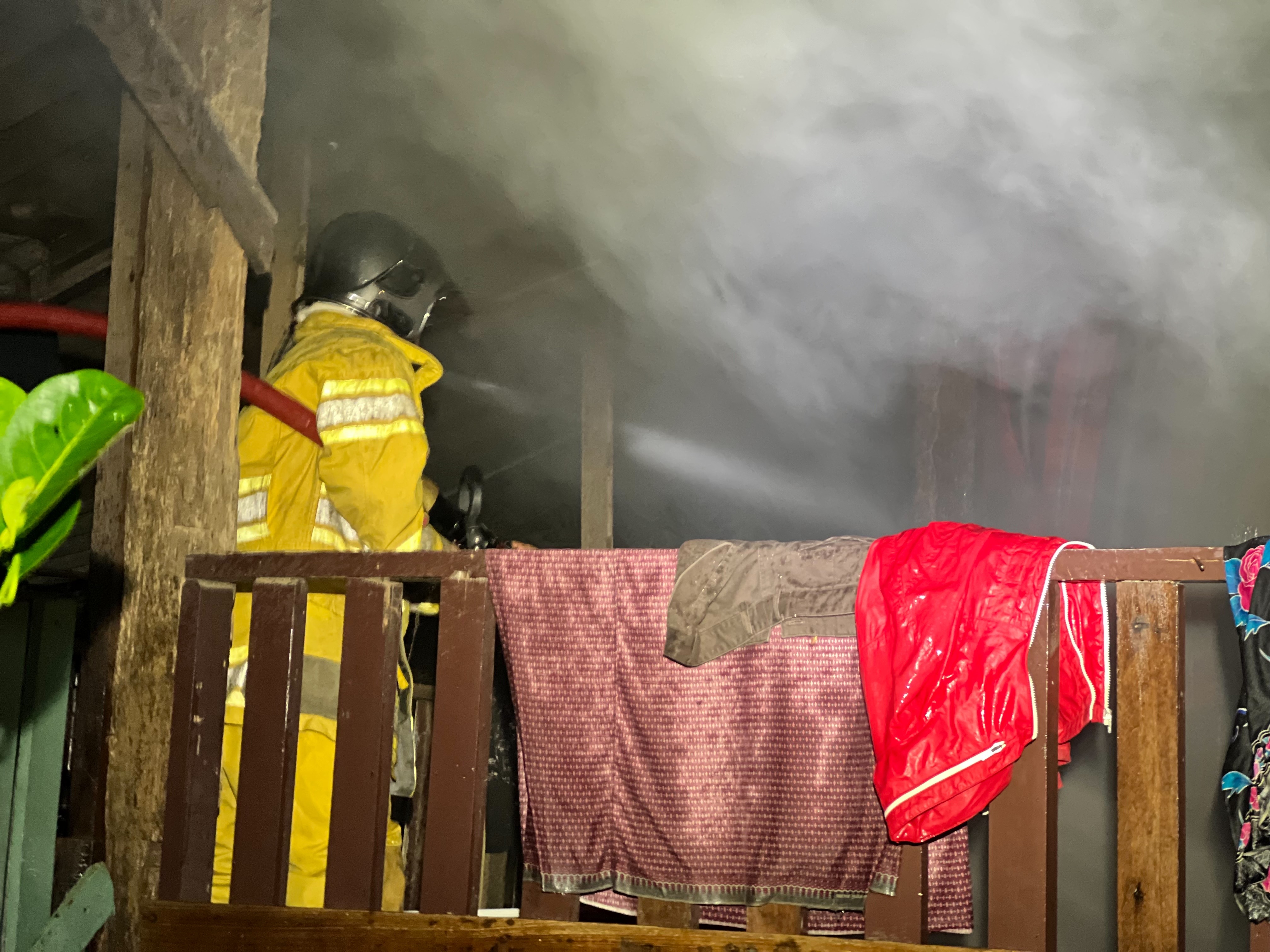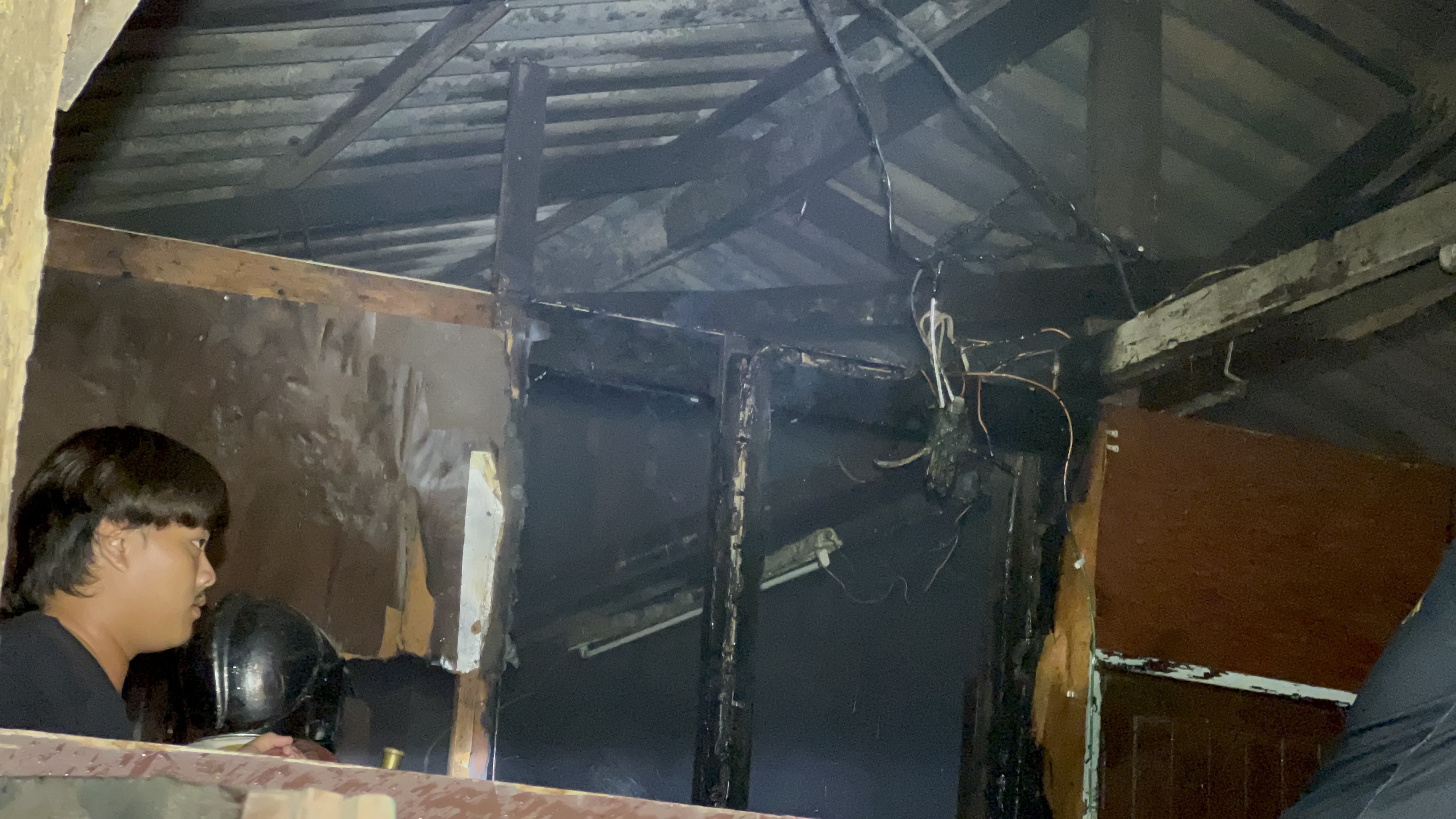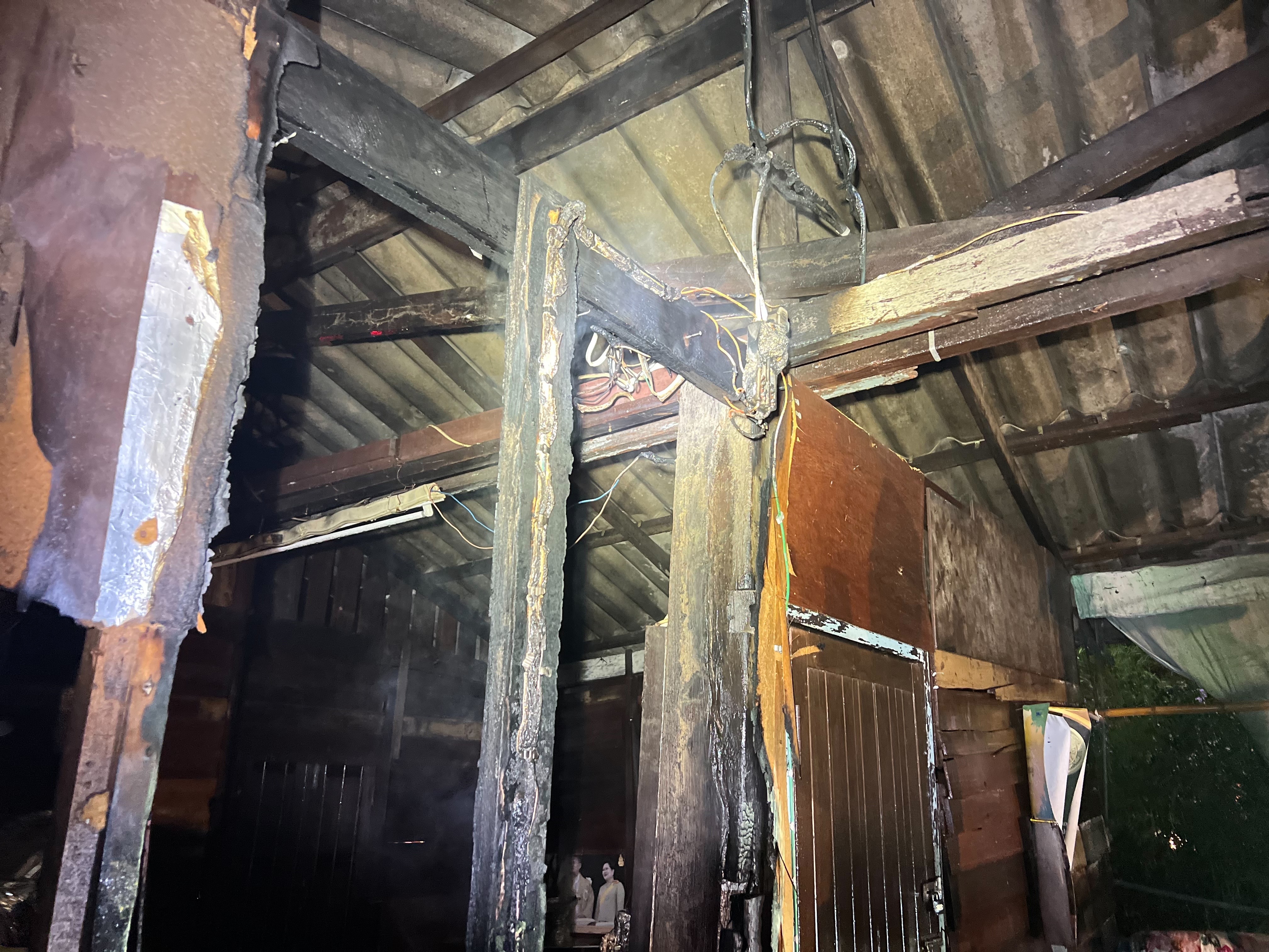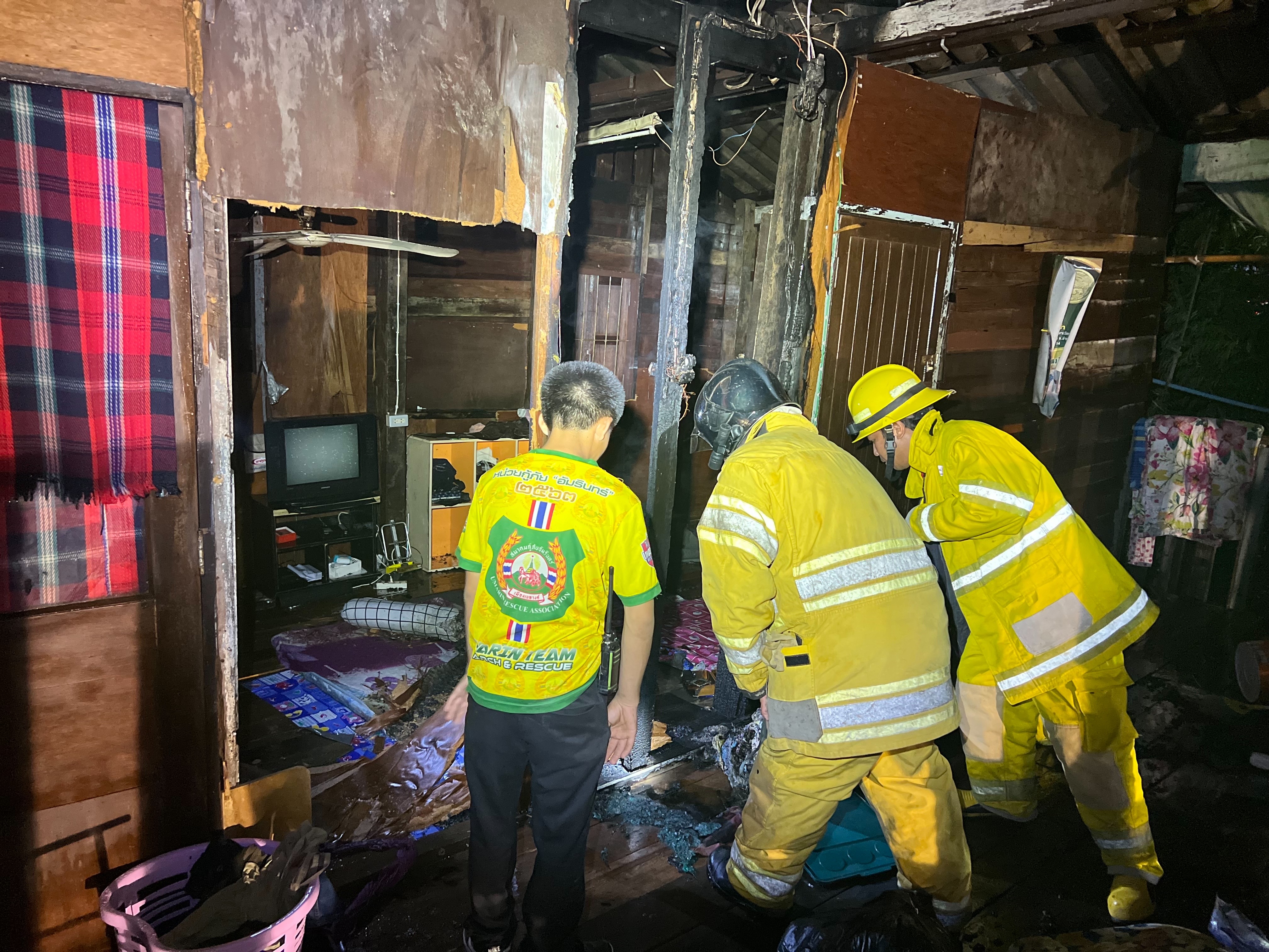 ในที่เกิดเหตุ เป็นบ้านไม้ยกพื้นสูง มีไฟไหม้ภายในโถงกลางบ้าน เ จ้าหน้าที่จึงเร่งฉีดน้ำควบคุมเพลิง ใช้เวลาประมาณ 15 นาทีจึงสามารถควบคุมเพลิงเอาไว้ได้ โดยพบว่าไฟได้ไหม้บ้านเสียหายบริเวณเสากลางบ้าน