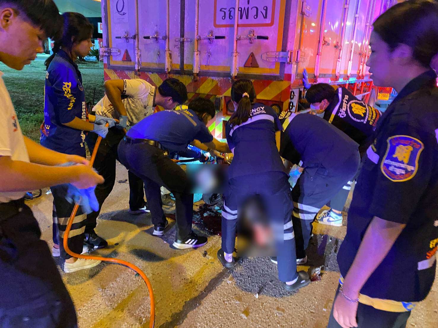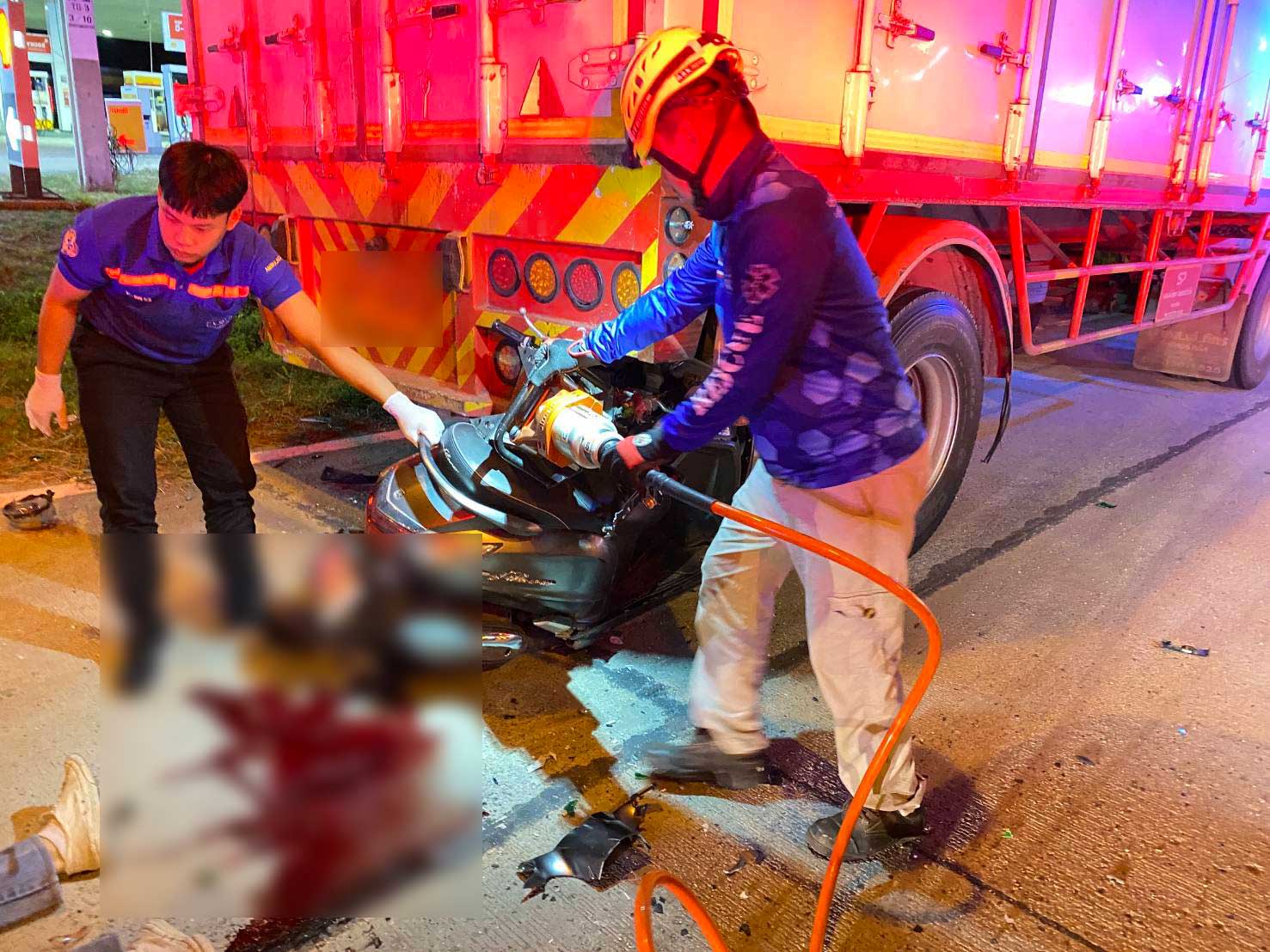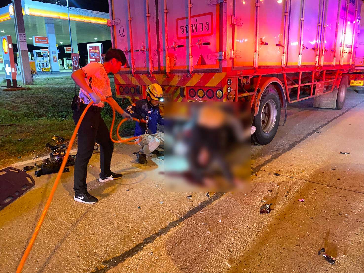 เมื่อเจ้าหน้าที่ไปถึงที่เกิดเหตุ พบรถจักรยานยนต์พุ่งชนท้ายรถบรรทุกพ่วงขนาดใหญ่ในลักษณะความเร็วสูง สภาพหน้ารถพังยับเยิน ผู้ขับขี่รถจักรยานยนต์เป็นชาย เสียชีวิตคาที่ในจุดเกิดเหตุ เจ้าหน้าที่ได้ปิดการจราจรชั่วคราวหนึ่งช่องทางเพื่อทำการตรวจสอบและเคลียร์พื้นที่ เบื้องต้นอยู่ระหว่างการสอบสวนหาสาเหตุที่แน่ชัด โดยจะมีการตรวจสอบกล้องวงจรปิดใกล้เคียงและสอบปากคำพยานเพิ่มเติม
