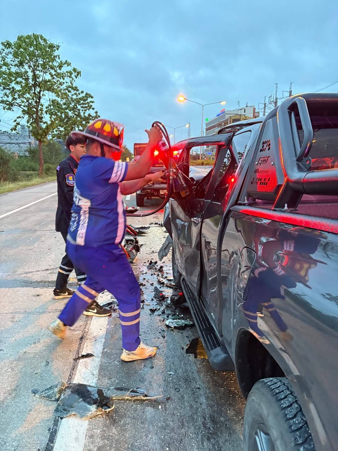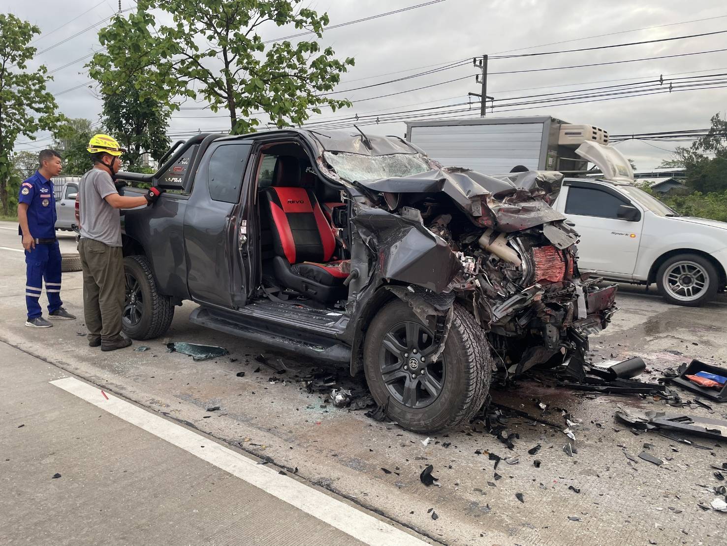 ในที่เกิดเหตุพบผู้บาดเจ็บติดภายในรถกระบะจำนวน 2 ราย เป็นชายทั้งสอง รายแรกไม่รู้สึกตัวและไม่มีสัญญาณการหายใจ ขณะที่อีกรายยังคงหายใจอยู่แต่หมดสติ