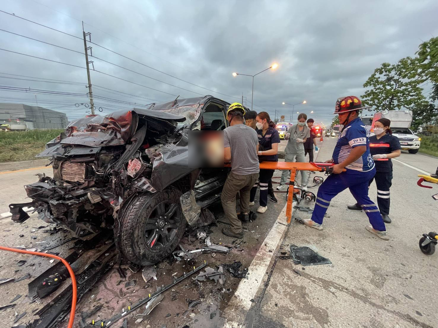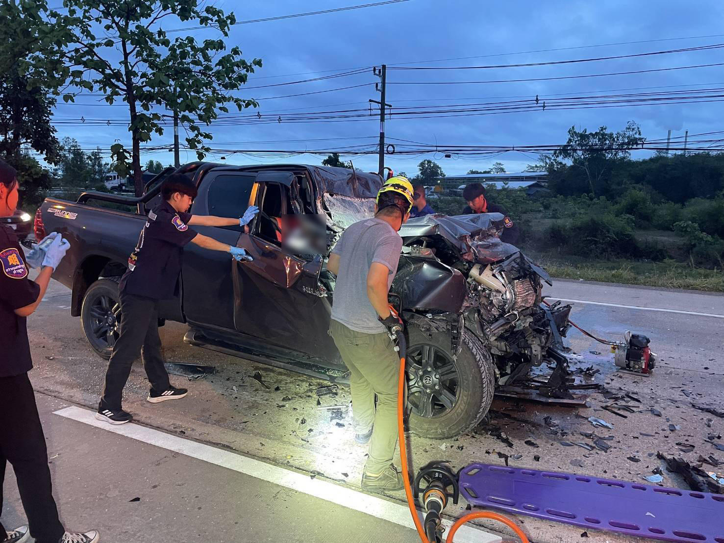 หน่วยกู้ภัยทางหลวง 505 และ 513 พร้อมอุปกรณ์ตัดถ่างจากรถกู้ภัย 810 สนับสนุนการช่วยเหลือร่วมกับเจ้าหน้าที่กู้ภัยสว่าง โดยเร่งดำเนินการนำผู้บาดเจ็บออกจากตัวรถอย่างเร่งด่วน