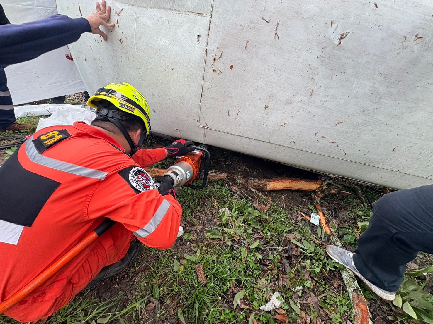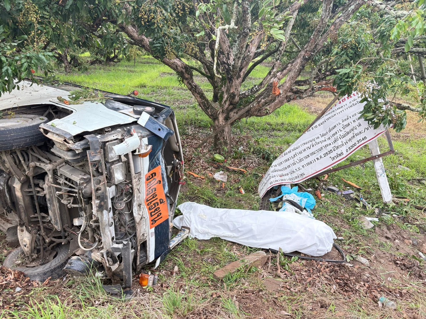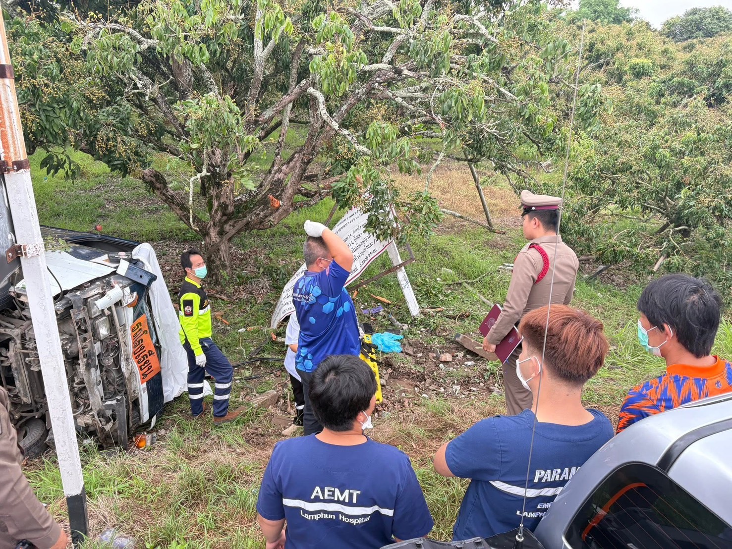 มีร่างคนขับติดใต้ท้องรถ ทางกู้ชีพฯในพื้นที่ พร้อมด้วย หน่วยกู้ภัยทางหลวงลำพูน-ลำปาง รถอุปกรณ์ตัดถ่างและค้ำยัน505 รถอุปกรณ์ตัดถ่าง 810 กู้ภัยร่วมใจ ออสซี่ สื่อสาร พนักงานสอบสวน สภ.เหมืองจี้ ไปยังที่เกิดเหตุ พบข้าง ๆ ชึ่งเป็นสวนลำไย มีรถยนต์ตู้รับส่งนักเรียนพลิกตะแคงอยู่ มีร่างชายคนขับถูกรถทับเสียชีวิต ทางกู้ภัยฯได้ทำการนำร่างออกมาเป็นชายวัย 41 ปีชาวบ้านมะกอก ต.มะกอก อ.ป่าซาง จ.ลำพูน