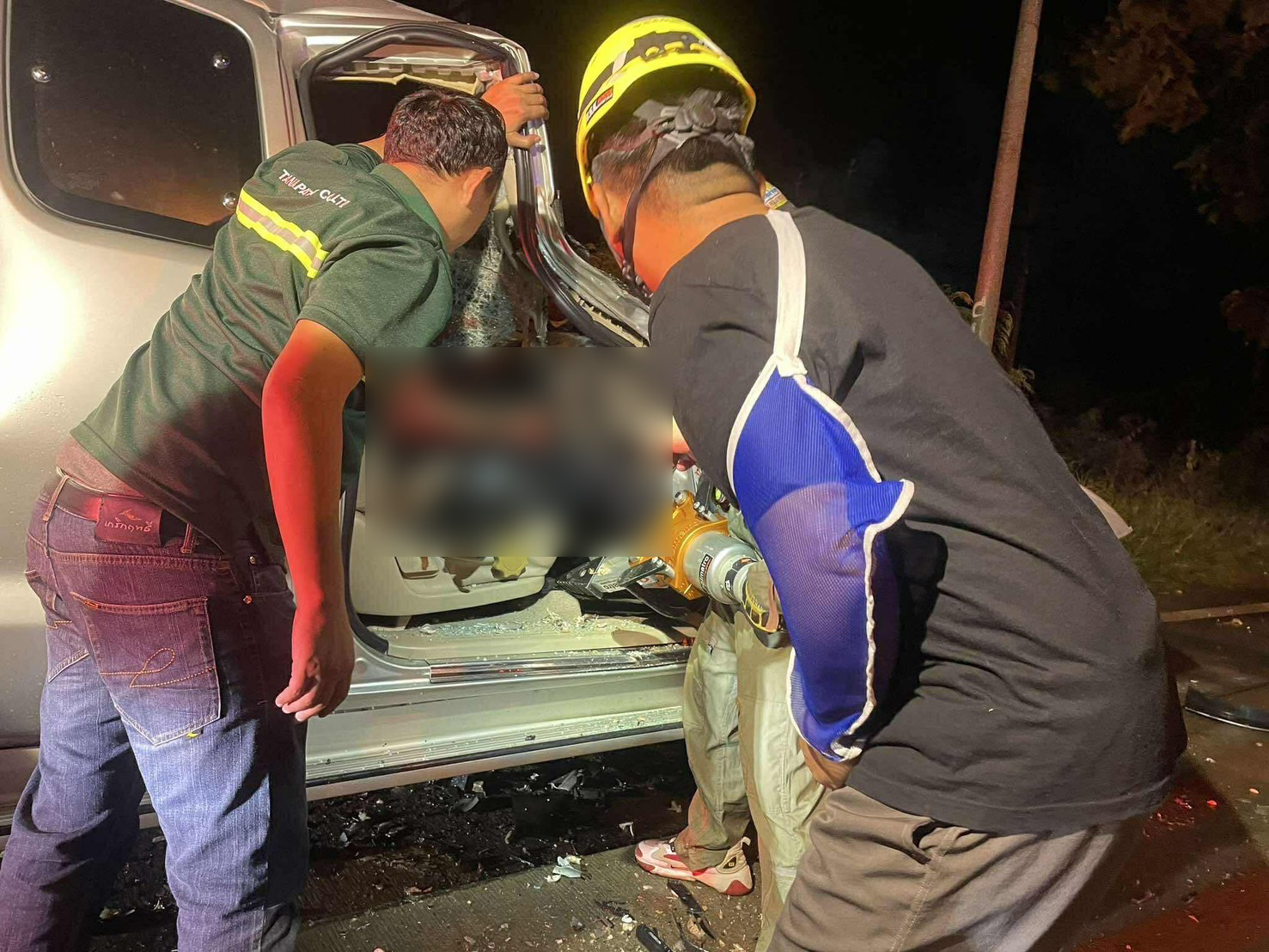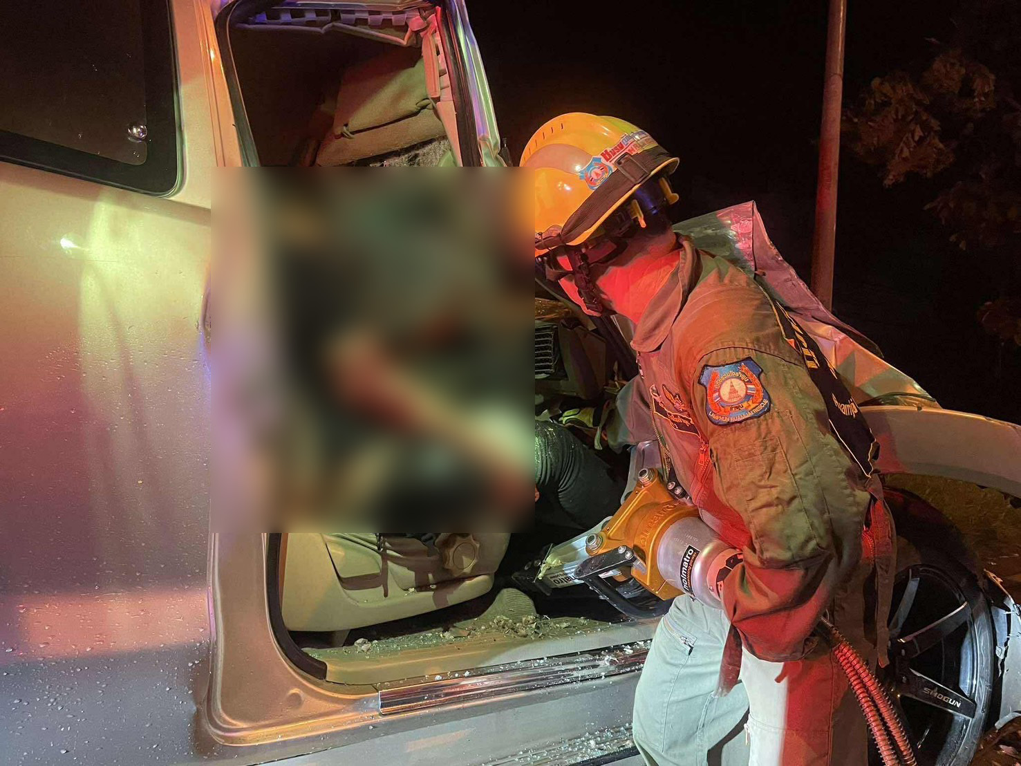 รถตรวจการณ์กู้ภัยเฉพาะกิจ 810 รีบเข้าหน้างาน พร้อมสนับสนุนอุปกรณ์ตัด–ถ่าง ทีมกู้ภัยพบชายผู้บาดเจ็บ 1 รายติดอยู่ภายในรถ แขน–ขาผิดรูป อาการน่าห่วง ทราบชื่อนายสมชาย อายุ 45 ปี อยู่หมู่ 2 ต.ห้วยโป่ง อ.เมืองแม่ฮ่องสอน
