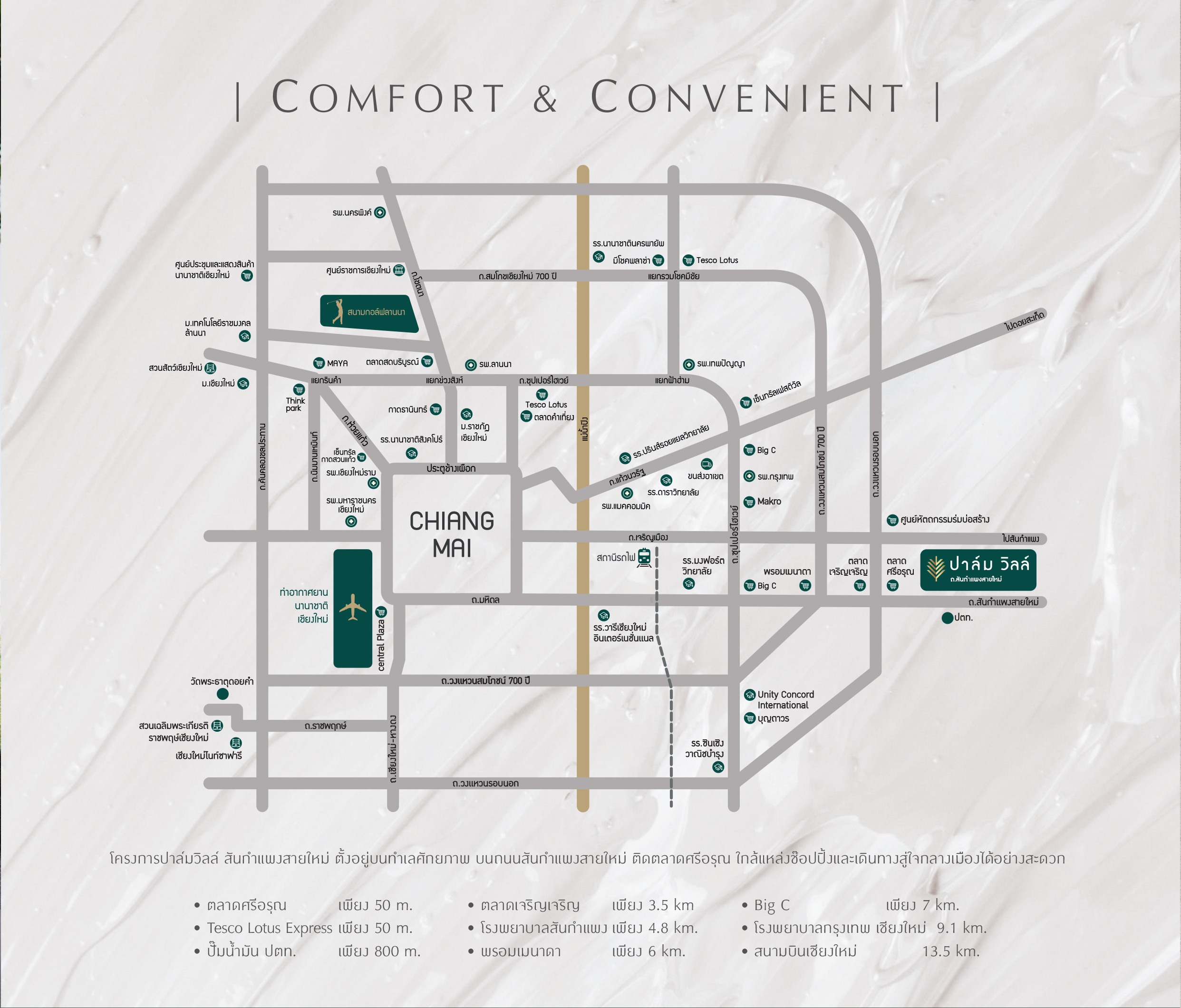 โครงการ Palm Ville ถ.สันกำแพงสายใหม่ ตอบโจทย์ทุกความต้องการ ด้วยทำเลที่ตั้งอยู่ในโซนที่กำลังเติบโตอย่างรวดเร็วในจังหวัดเชียงใหม่ มอบความสะดวกสบายให้กับผู้อยู่อาศัย ทั้งยังมีศักยภาพที่เติบโตอย่างต่อเนื่องในอนาคต ทั้งการใช้ชีวิตประจำวัน การเดินทาง ไลฟ์สไตล์ และการลงทุนในระยะยาว