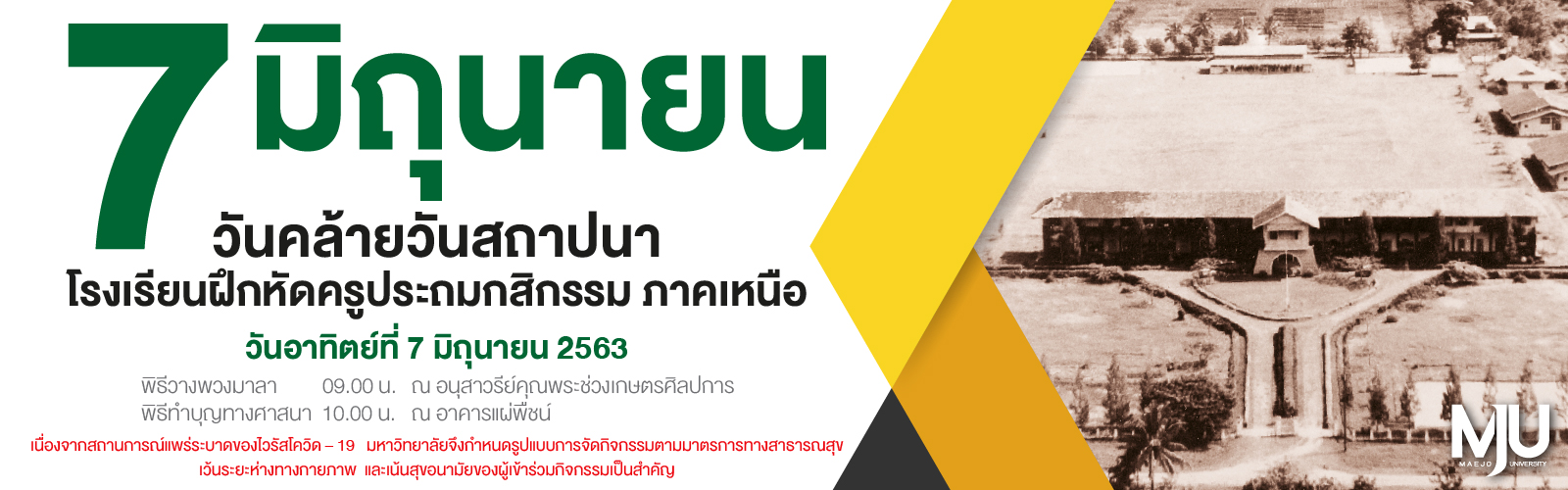 ในปีนี้ ได้จัดให้มีพิธีทำบุญวันคล้ายสถาปนาโรงเรียนฝึกหัดครูประถมกสิกรรม ภาคเหนือ ประจำปี 2563 ในวันอาทิตย์ที่ 7 มิถุนายน 2563 แต่เนื่องจากปัจจุบันประเทศไทย ประสบปัญหาการแพร่ระบาดของไวรัส COVID-19 มหาวิทยาลัยแม่โจ้ มีความห่วงใยต่อนักศึกษา บุคลากร และผู้มาร่วมพิธีทุกท่าน จึงได้มีมาตรการป้องกันการแพร่ระบาดของโรค กำหนดรูปแบบการจัดกิจกรรมตามมาตรการทางสาธารณสุข เว้นระยะห่างทางกายภาพ และเน้นสุขอนามัยของผู้เข้าร่วมกิจกรรมเป็นสำคัญ โดยกิจกรรมจะเริ่มตั้งแต่เวลา 08.09 น. เป็นต้นไป จะมีพิธีบวงสรวงพระพิรุณทรงนาค นำโดยนายกสภามหาวิทยาลัย นายกสมาคมศิษย์เก่า และอธิการบดี พร้อมคณะผู้บริหาร จากนั้นจะเป็นพิธีวางพวงมาลาคารวะอนุสาวรีย์คุณพระช่วงเกษตรศิลปการ โดยผู้แทนองค์กรหลัก และพิธีทำบุญทางศาสนา ณ อาคารแผ่พืชน์