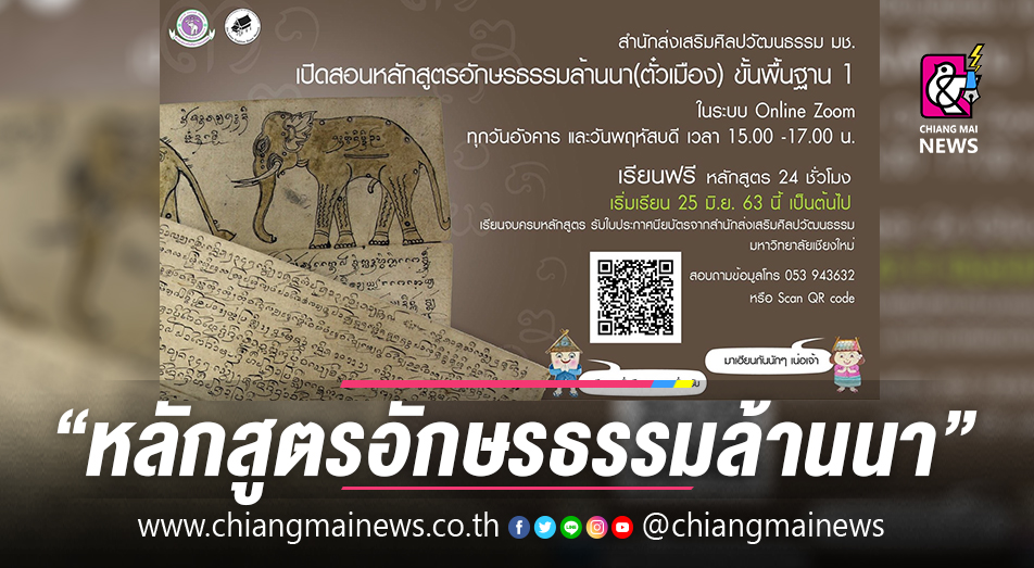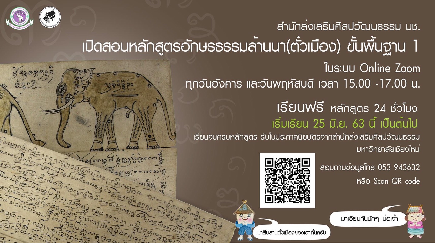 สำนักส่งเสริมศิลปวัฒนธรรม มหาวิทยาลัยเชียงใหม่ เปิดสอนหลักสูตรอักษรธรรมล้านนา (ตั๋วเมือง) ขั้นพื้นฐาน 1 หลักสูตร 24 ชั่วโมง “ฟรี ไม่มีค่าใช้จ่าย” เรียนทุกวันอังคาร เเละวันพฤหัสบดี เวลา 15.00 – 17.00 น. เริ่มเรียน 25 มิถุนายน 2563 โดยเรียนในรูปแบบ Online ผ่านโปรเเกรม Zoom สอนโดย อาจารย์ สนั่น ธรรมธิ
