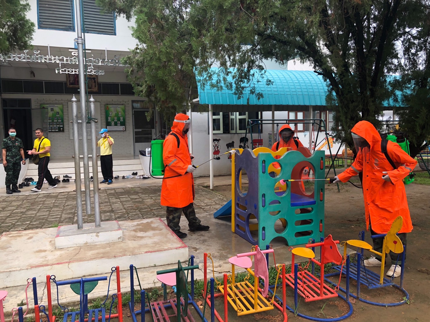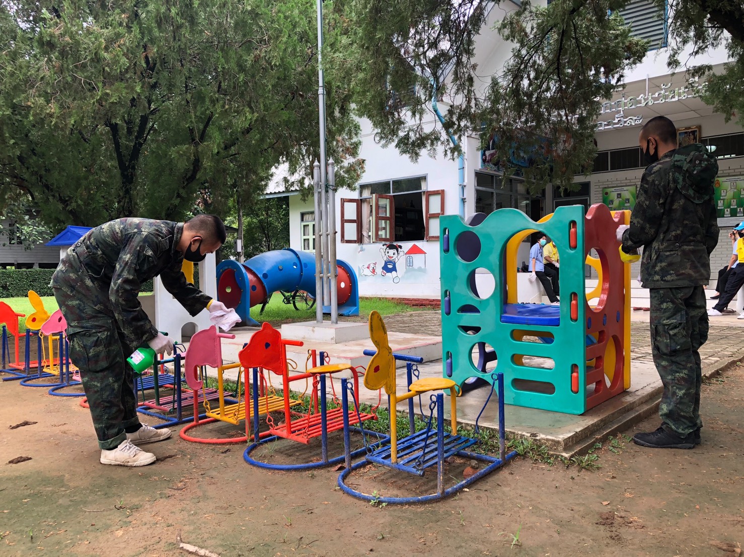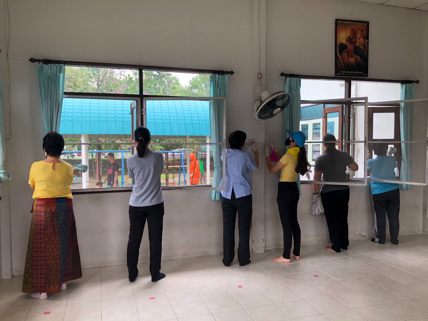 โดยได้ช่วยกันทำความสะอาดพื้น เช็ดทำความสะอาดผนัง ประตู หน้าต่าง ราวจับ ราวบันได โต๊ะ เก้าอี้ อุปกรณ์สำนักงานต่าง รวมไปถึงเครื่องเล่นในสนามเด็กเล่นของโรงเรียน ซึ่งเป็นพื้นที่ที่ทุกคนต้องใช้งานร่วมกัน เพื่อช่วยลดการสะสมของเชื้อโรค ป้องกันการแพร่กระจายของเชื้อไวรัสโควิด-19 ให้น้อง ๆ นักเรียนได้เรียนอย่างปลอดโรคและปลอดภัย