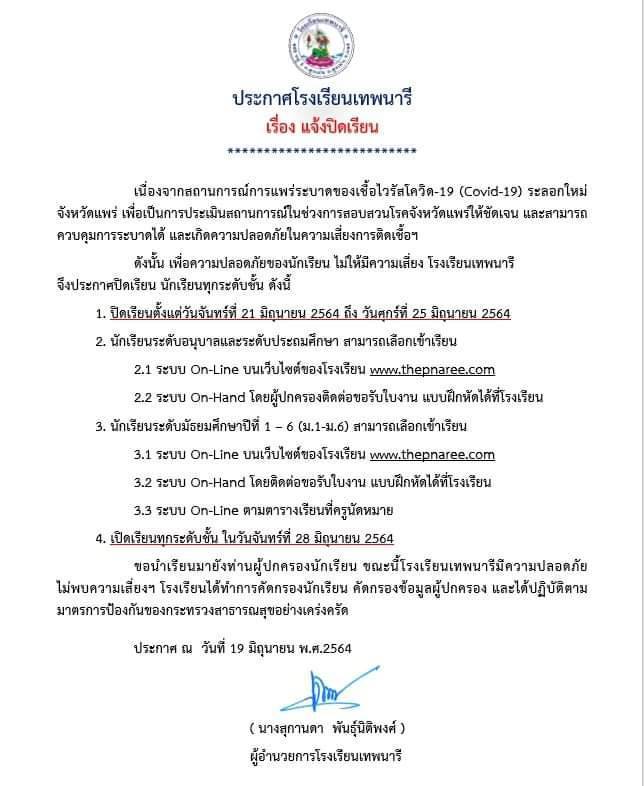 ประกาศ ณ วันที่ 19 มิถุนายน พ.ศ.2564 นางสุกานดา พันธุ์นิติพงศ์ ผู้อำนวยการโรงเรียนเทพนารี