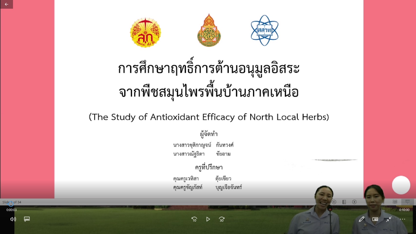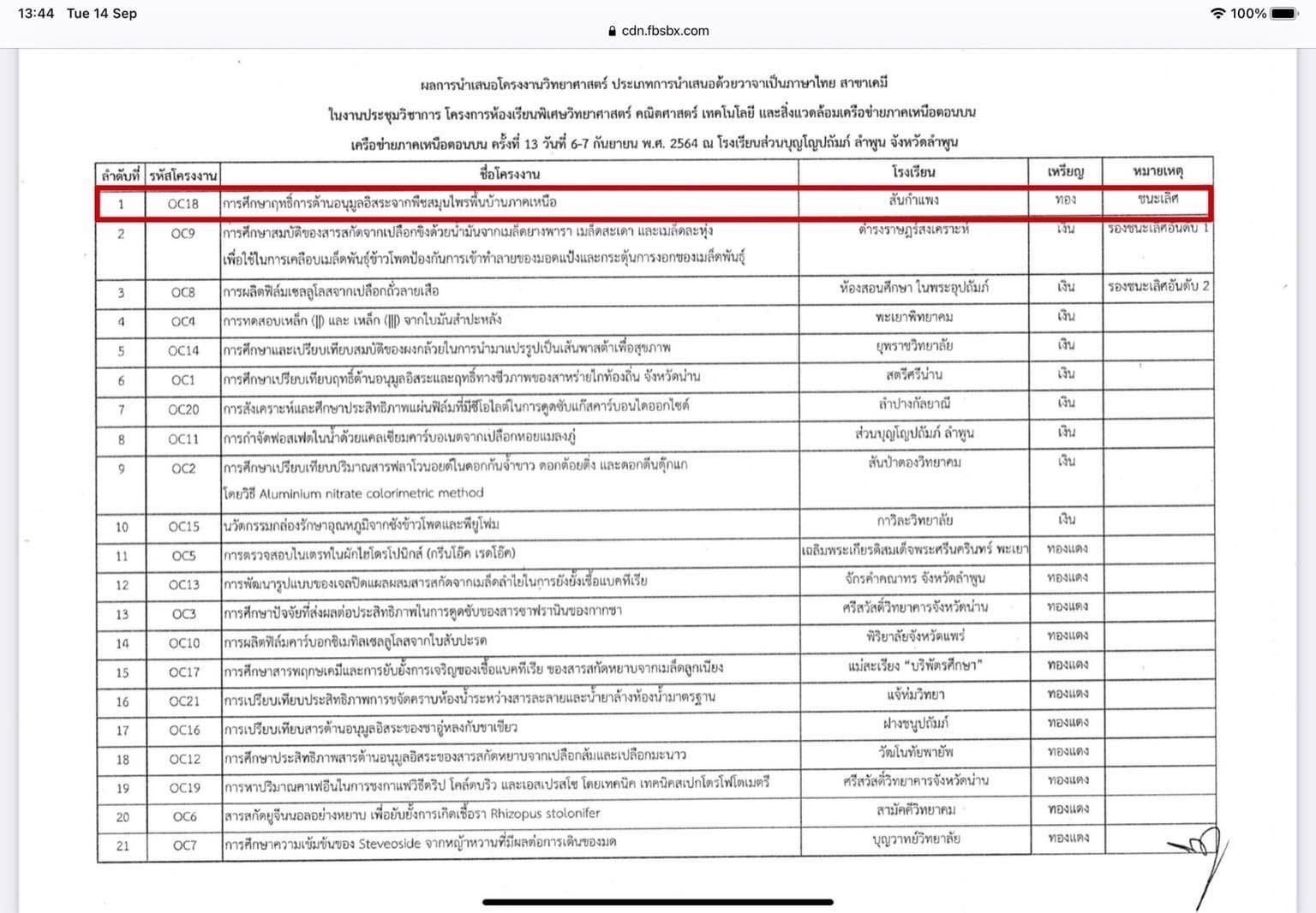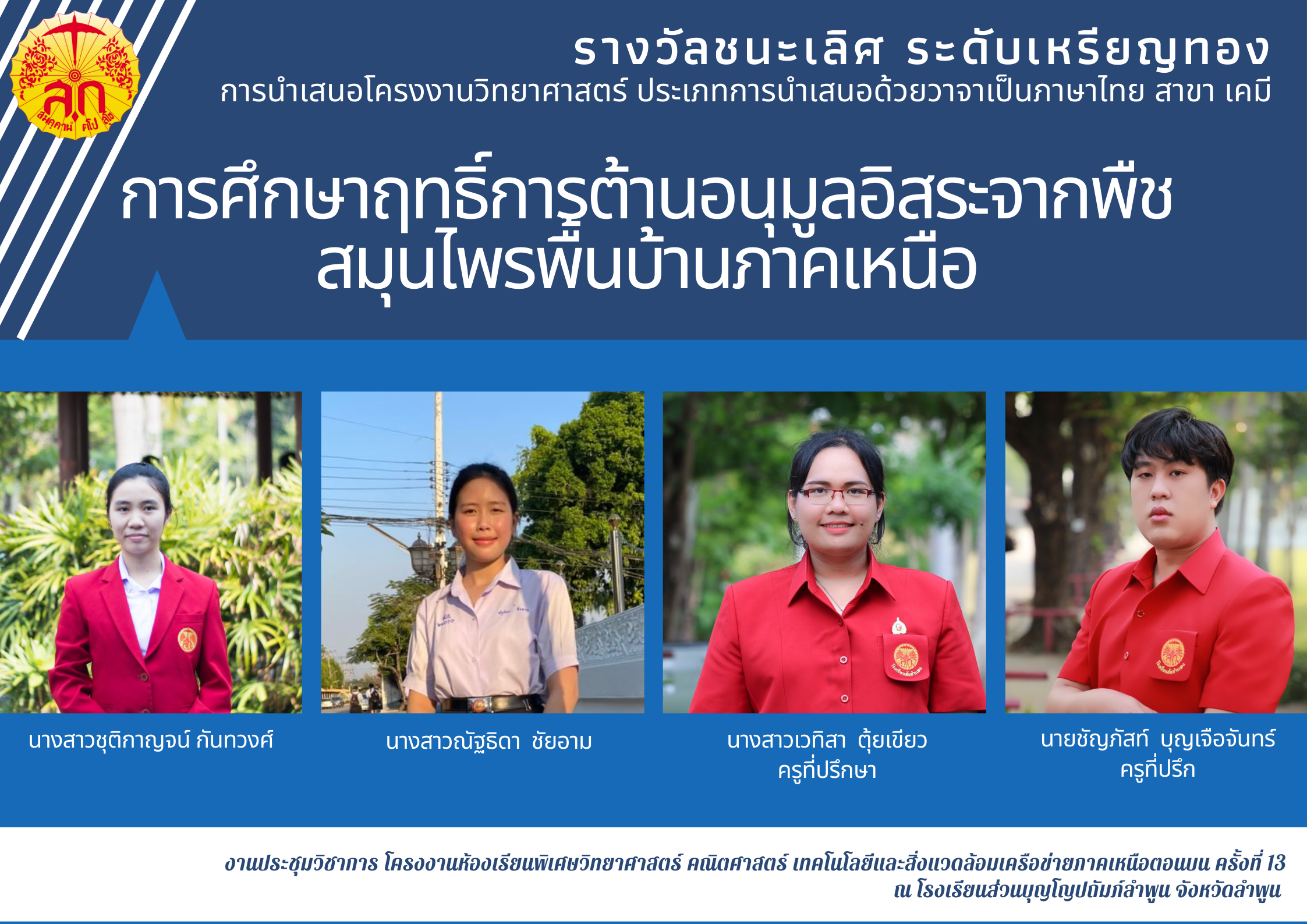 นักเรียนโรงเรียนสันกำแพงรับเกียรติบัตรระดับเหรียญทอง ชนะเลิศ สาขาเคมี “การศึกษา ฤทธิ์การต้านอนุมูลอิสระจาก พืชสมุนไพรพื้นบ้าน ภาคเหนือ “