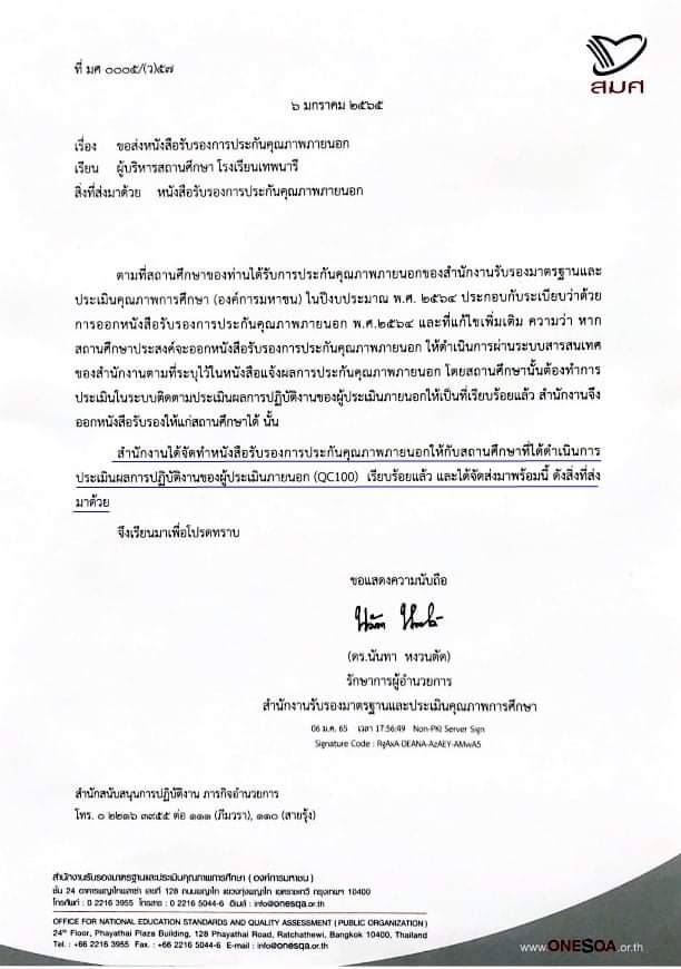 โรงเรียนเทพนารี ผ่านฉลุย! ผลงานพัฒนาคุณภาพการศึกษาผ่านการประเมินภายนอกและรับรองมาตรฐานจาก สมศ.ทุกระดับชั้นเรียน
