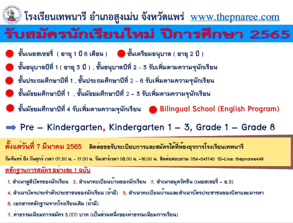 โดยรับสมัครตั้งแต่วันที่ 7 มีนาคม 2565 ติดต่อขอรับระเบียบการและสมัครได้ที่ห้องธุรการโรงเรียนเทพนารี