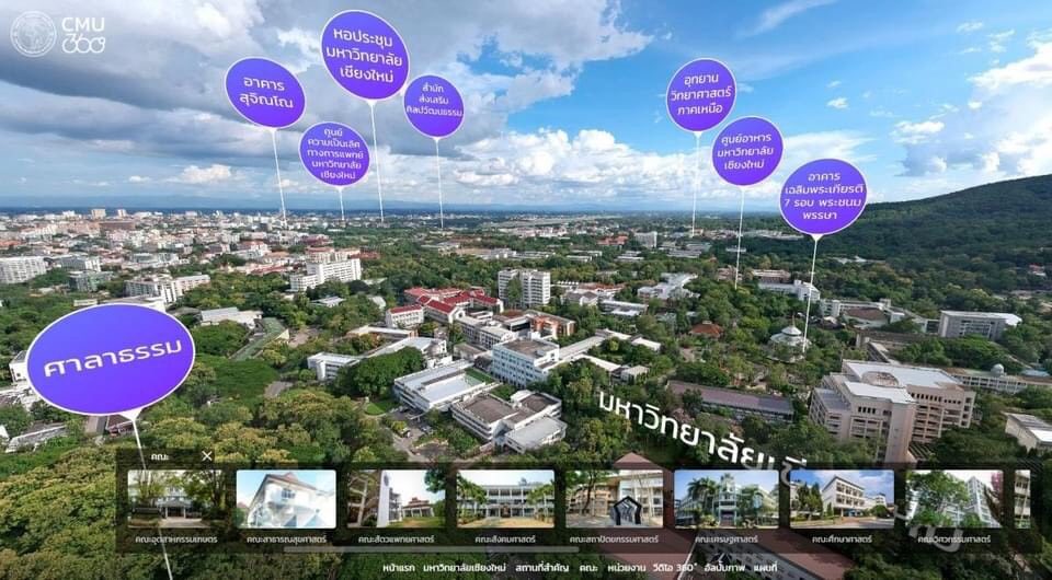 พิเศษสำหรับผู้ปกครองและนักศึกษาใหม่ทุกท่าน ในการเข้าถึงสถานที่ต่างๆ ของมหาวิทยาลัย สามารถทำได้ง่ายๆ เพียงปลายนิ้วสัมผัส บนระบบ Virtual Tour 360 องศาของมหาวิทยาลัยเชียงใหม่ ผ่านเว็บไซต์ https://cmu.ac.th/360/ สร้างความรู้สึกเสมือนอยู่ในสถานที่จริง พร้อมแผนที่นำทางให้ทุกท่านสนุกและเพลิดเพลินไปกับการเยี่ยมชม มช.